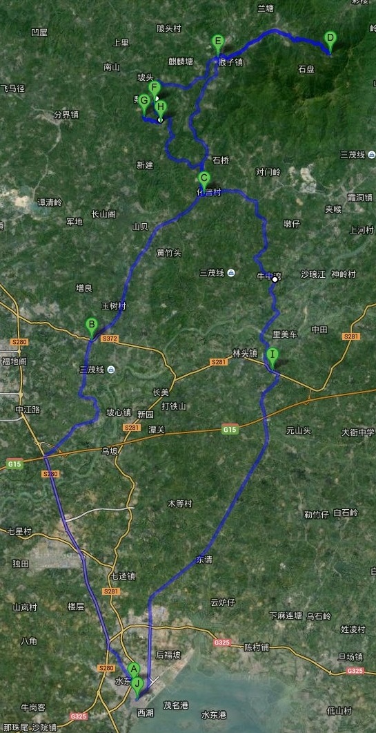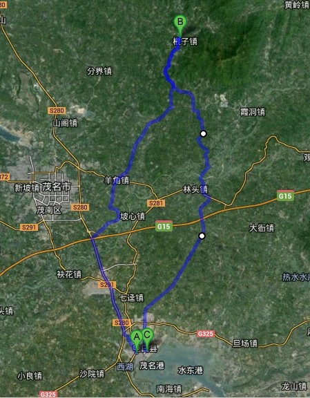 活动安排:1月5日星期日早上8:20-8:30在水东城岭路口集合(去程地图A点),8:30准时出发;行程首先从水东经高水路进羊角,然后从化普入根子,到达根子后将由本地车友带领游览贡园/江总手植中华红/冼太庙/浮山岭等;返程经林头上水林路返水东,全程约90公里。此次线路为探索线路,部分路况未明,请有心参与的骑友做足线路攻略。当天活动行程暂不安排吃中餐,请参加活动的骑友备足饮用水与干粮(建议带压缩饼干,超市有售),晚饭将在根子就餐,暂有根子车友宴请晚餐,视情况如需A餐费的话,约30元/人以下,现场AA。