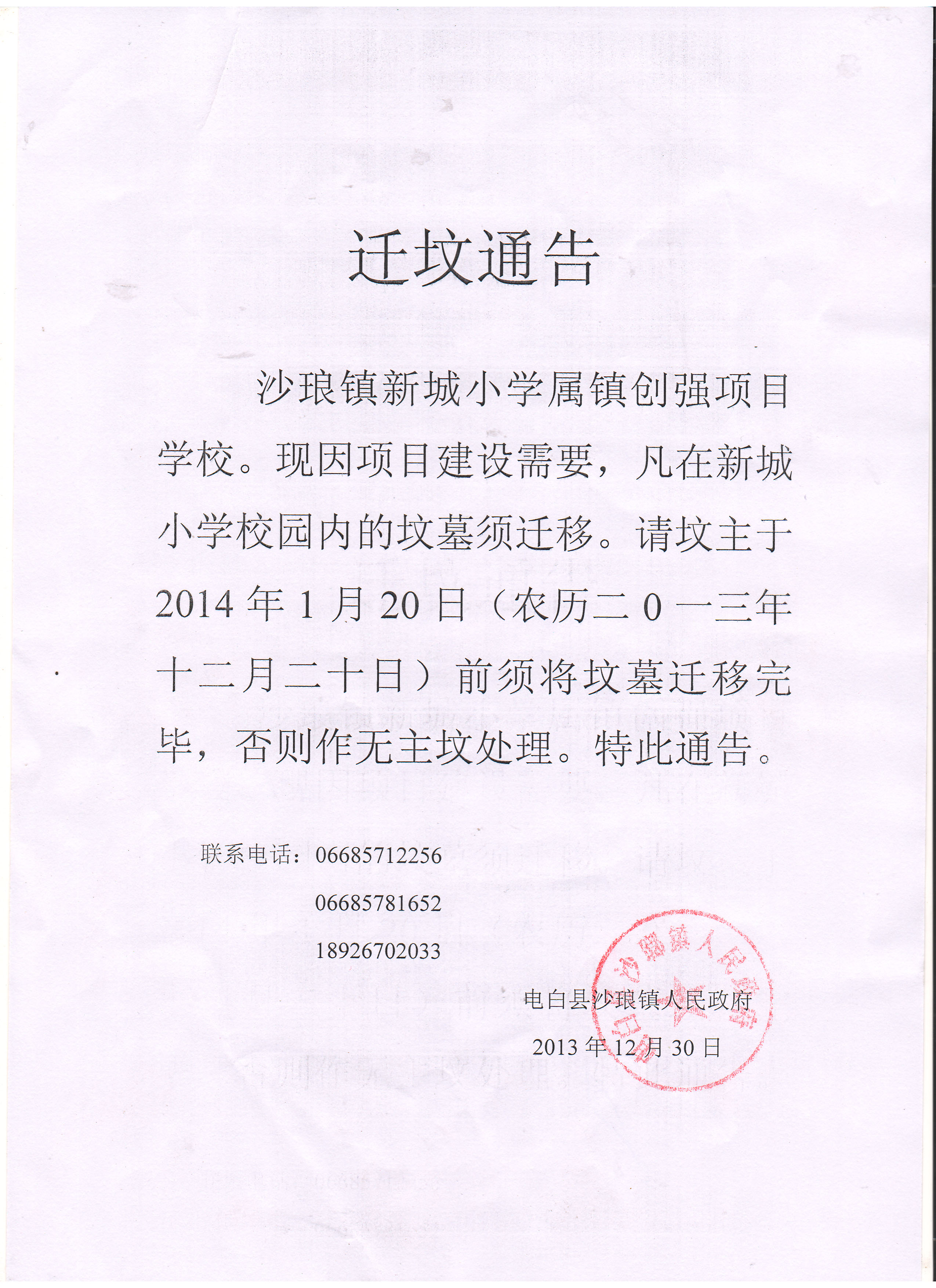 电白县沙琅镇新城小学迁坟通告
