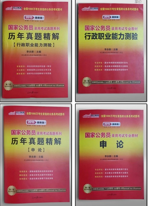 绝对正版,绝对全新未使用,书封底网上学习一卡通密码账号全部未开,如假包退。 2015国家公务员录用考试专业教材-申论 定价:49元 2015国家公务员录用考试专业教材-行测 定价:59元 2015国家公务员录用考试真题系列历年真题-申论 定价:39元 2015国家公务员录用考试真题系列历年真题-行测 定价:52元 全新四本套只要60元。水东当面交易。 欲购从速,机不可失。 联系qq:546576800