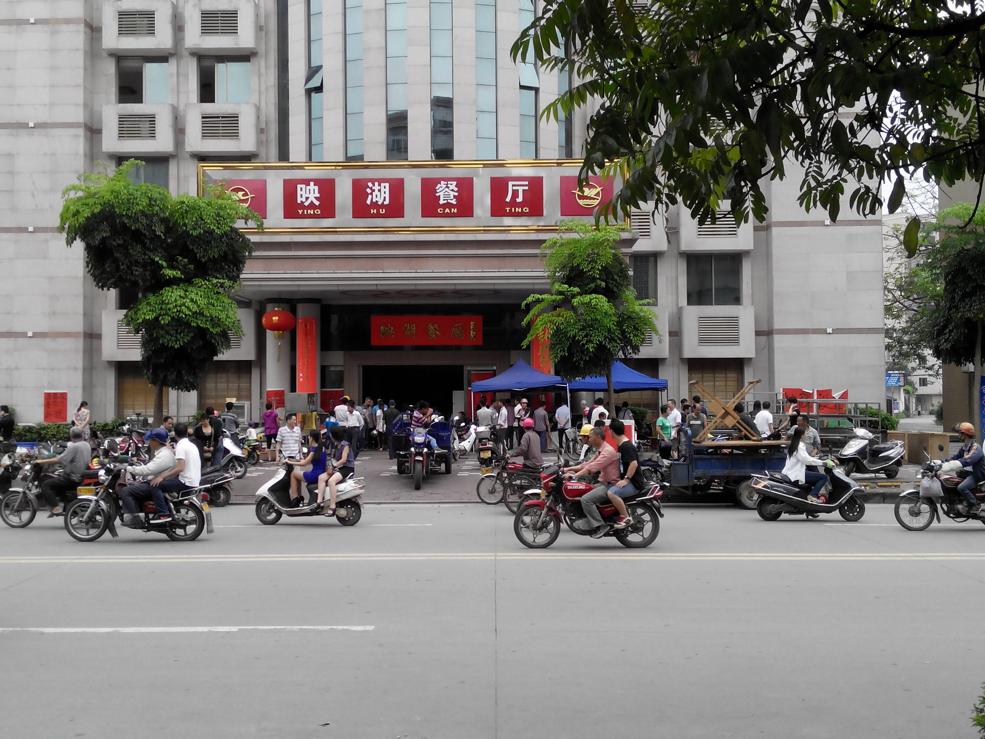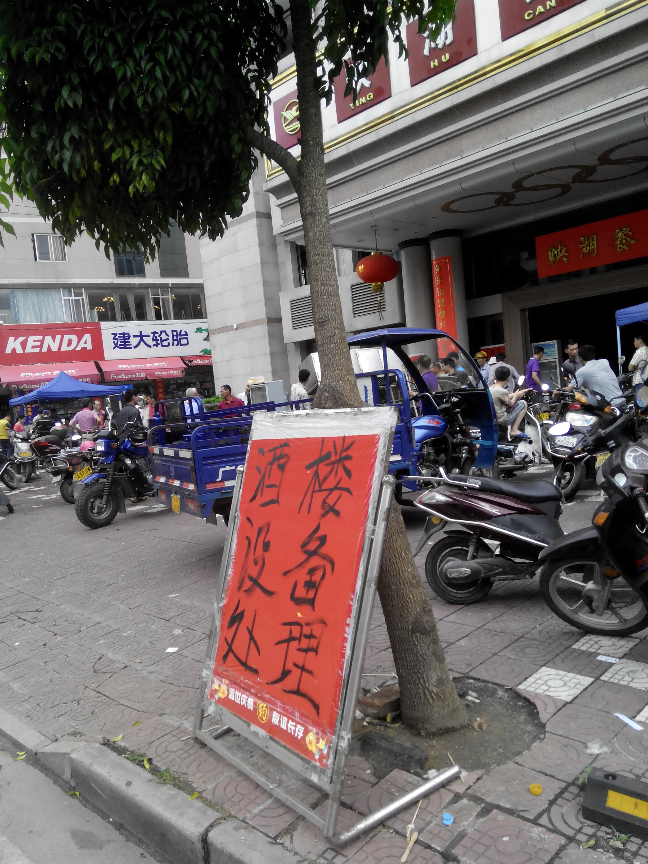 游玩完西湖,大家都饿了,我就带他们去映湖餐厅吃饭,选择映湖的理由是,每一年八一建军节,我们那帮老兵都在这里聚会,吃出感情来了。 没想到来到门口,见到很多人围在那里,很多电视机,桌子电视柜,碗碗碟碟摆在那里,有人大声叫卖。仔细打听,原来是映湖收水了。 看来习总打击公款吃喝力度够大,连远在天边的水东都受到影响。 我照了几张照片留念,然后无奈带大家去附近的冲记快餐吃了几个盒饭。山龟们都说水东的盒饭好好吃,比沙琅沉香南盛的酒席还好吃。