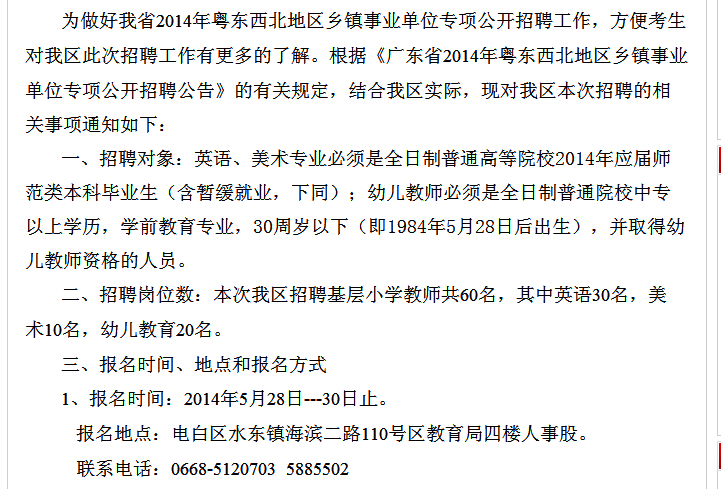 为做好我省2014年粤东西北地区乡镇事业单位专项公开招聘工作,方便考生对我区此次招聘工作有更多的了解。根据《广东省2014年粤东西北地区乡镇事业单位专项公开招聘公告》的有关规定,结合我区实际,现对我区本次招聘的相关事项通知如下: