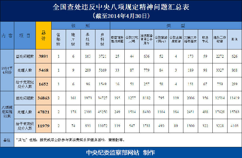 为掌握全国贯彻落实中央八项规定精神情况,中央纪委在31个省(区、市)和新疆生产建设兵团、59个中央和国家机关建立了落实中央八项规定精神情况月报制度。截至2014年4月30日,全国查处违反中央八项规定精神问题情况如下: [attachmentid=326862]