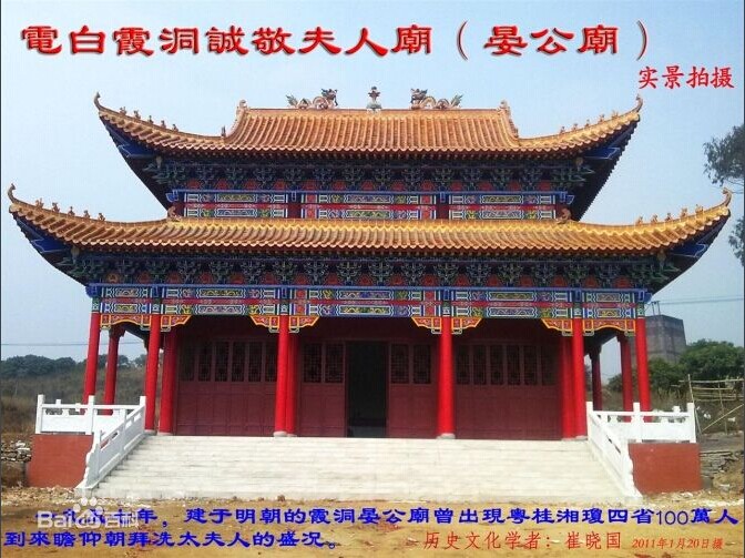 在明朝初期,霞洞有两个桥夫,一姓王,一姓崔,一向很要好。由于家穷,便合伙抬轿过生活。一天,两人从霞洞抬客到高州,回来时已是两点钟了。由于没有回头客,少了收入,因此闷闷不乐。不料才离开高州一里多,路边有一位穿戴得十分华丽的老太婆叫他俩停轿,她说要到霞洞,如果肯抬她,愿意给他们一千两银子。两个轿夫非常高兴,忙请她上轿。他们抬着这位老太婆在路上飞快地走着,感觉到全不用费力气,好像抬空轿一样。仅仅四个小时,就到了霞洞的鸡笼岭山下。这时,轿内的老太婆忽然叫他俩停桥,她说要解手。这两个轿夫把轿放下,扶出老太婆后就地等候着。但是等呀等,足足等了一个钟头,还未见她出来。这时太阳已下山了,两个轿夫都很担心,生怕她会被老虎吃了,急忙进深山里叫喊寻觅,但总不见踪迹,后来忽然发现在一块大石下有一个香炉,香炉上刻着“冼太夫人”四个字,再看看,香炉底还压着一锭钱,他俩拿出这一锭钱数一数,正好一千两。两人不约而同地说:“啊!原来我们抬的是冼太夫人神,怪不得这么轻呢!”他们高兴地把钱收起,一同向香炉拜了三拜,才走出森林抬着空轿飞快跑回村,将这神奇的故事告知父老们。第二天,天刚朦亮,王崔两姓的人们纷纷跟着这两个轿夫去观看,果然香炉还在。人们还仔细观察这地形,无不称赞是个好地方。然后,王崔两姓的父老就合力凑款建起一座美丽的冼太夫人庙,并将夫人的身像塑造两个,同坐在一个神庵里,左边的一个属王族的,右边的一个属崔族的。