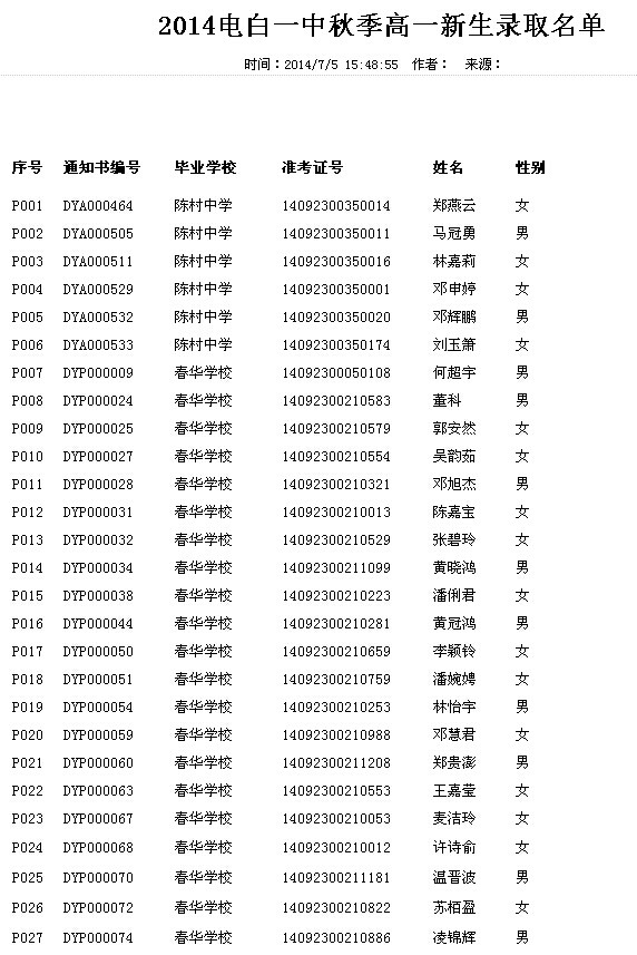 电白一中2014年中考录取生名单已公布