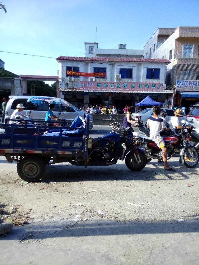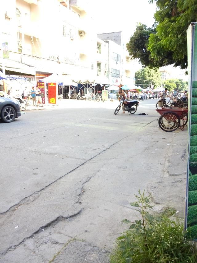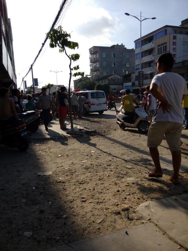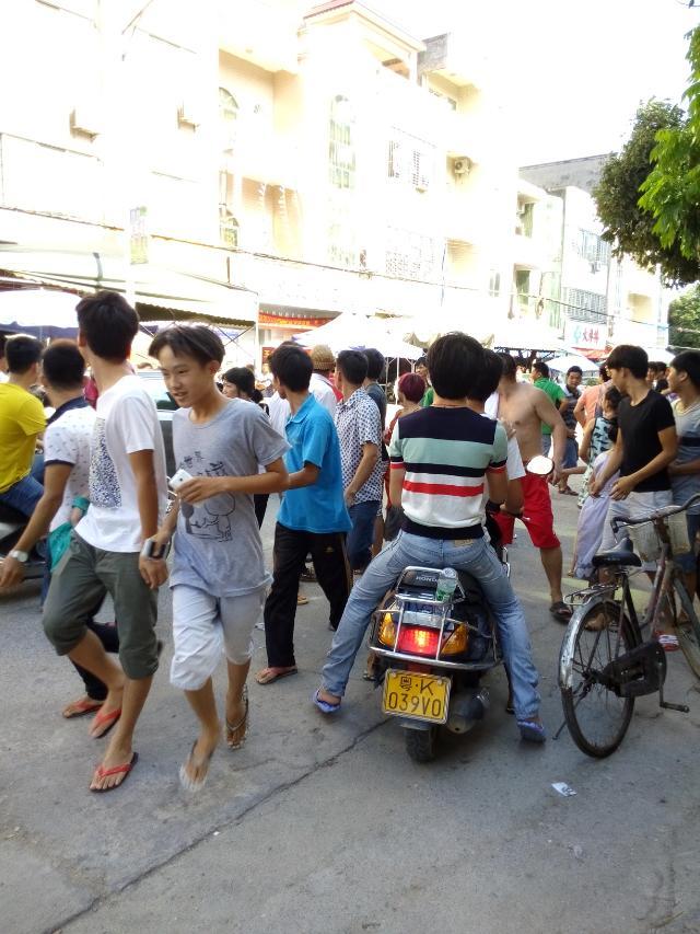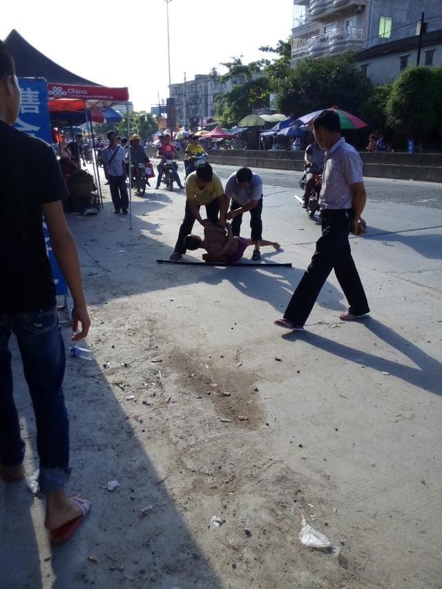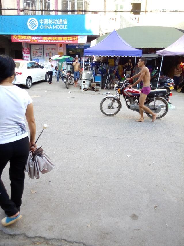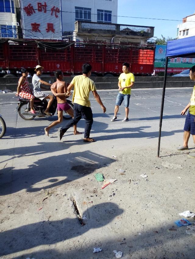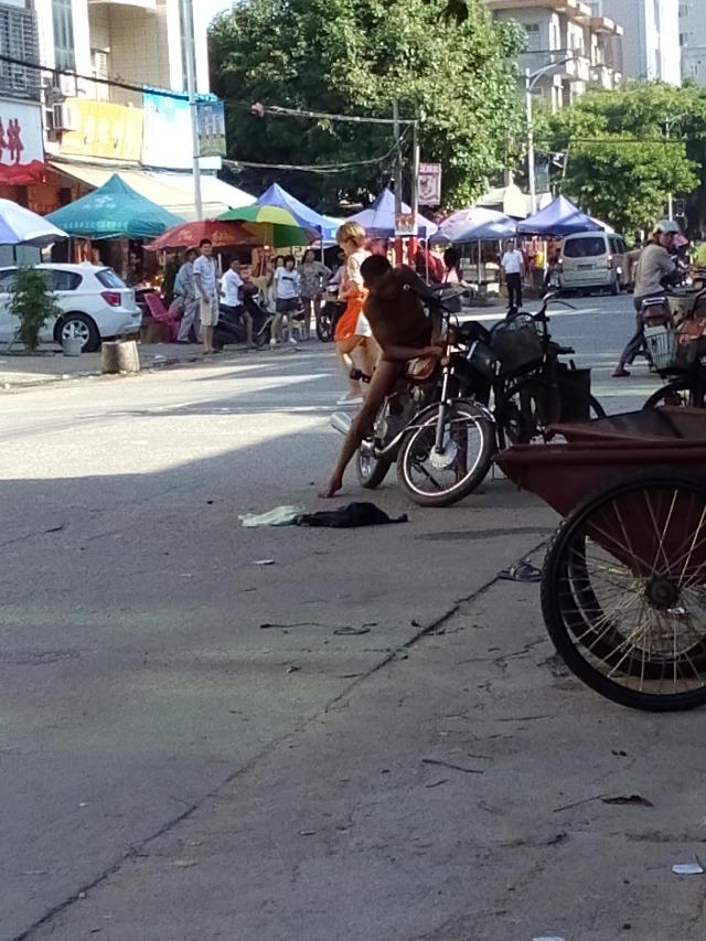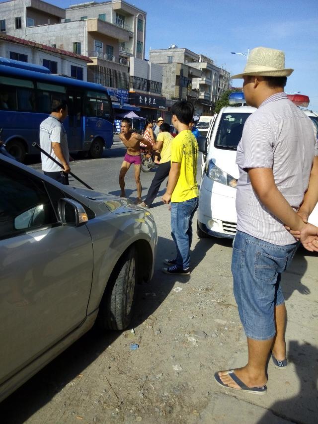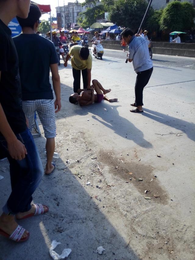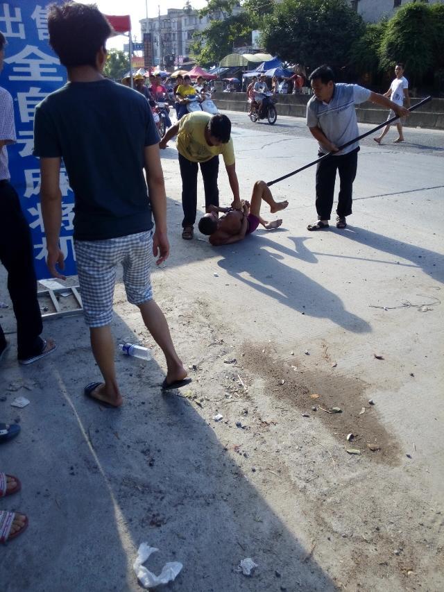 一名吸毒者怀疑吸毒后精神问题大闹麻岗圩,见车就拦,推自己的摩托裸身在大街上,最后派出所及时治服