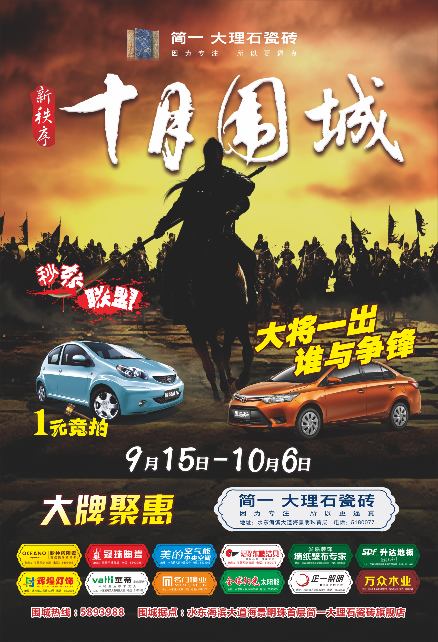 或许你现在忍受着漫天该地的广告煎熬!微信,微博,电视,户外等等。但回想一下你用的每一样产品哪一个是没有广告的呢?你会选择没有广告推广的产品吗? 好吧,那我现在就来做一下广告了!以下是我公司《澳美传媒广告有限公司》近期策划的一场家居建材的活动。 家居建材行业史无前例!买家居建材奖丰田汽车! 简一大理石瓷砖纠集各大建材品牌揭杆而起,启动【十月围城】将水东湾新城团团围住,高呼“王候将相,宁有种乎?”,挟【汽车大奖】以令诸侯,欲改写行业新秩序,一场浩劫,在所难免,望好自为之,从速下单!