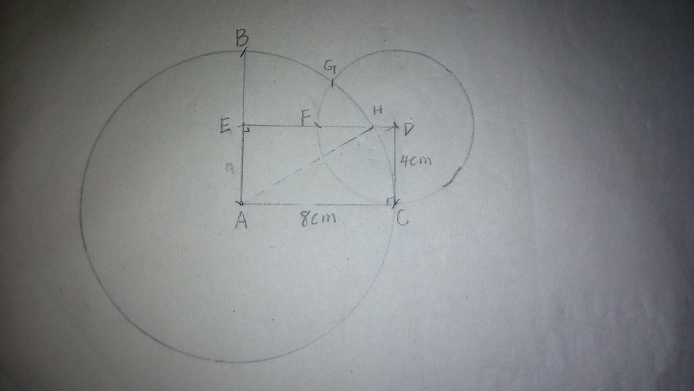 作虚线AH,AH即是大圆直径为 8cm。直角三角形AEH中,边AH是边AE的两倍,这是个特殊三角形,得出角A为60°。
