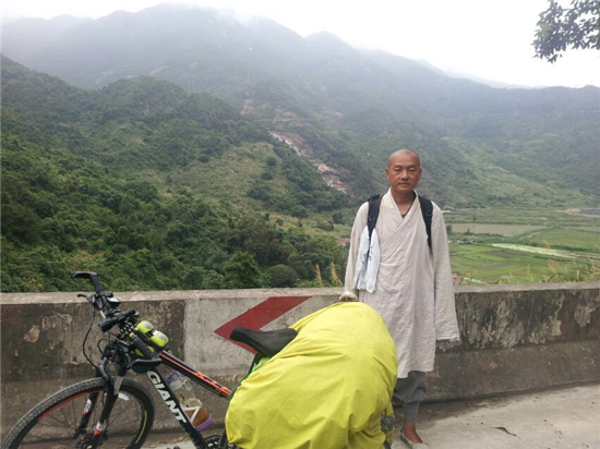 爬坡时遇到了一位“正在徒步”的大师,他从“韶关南华寺”开始,准备徒步到普陀寺!