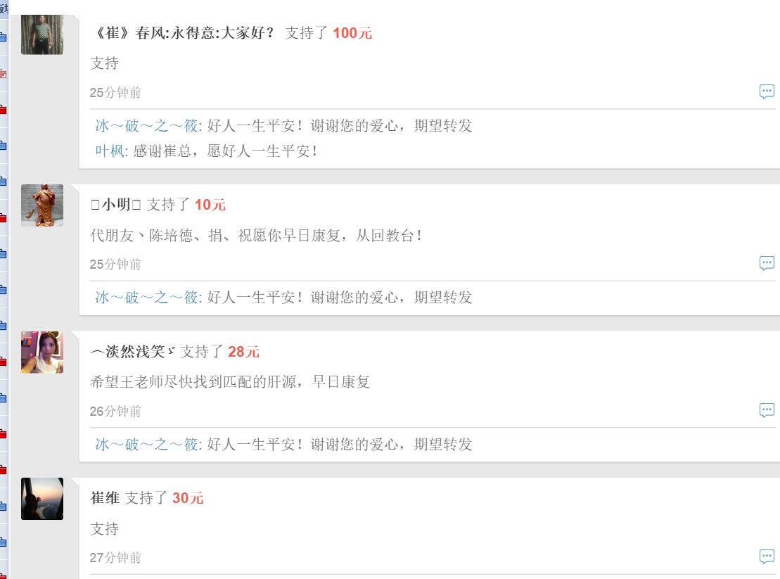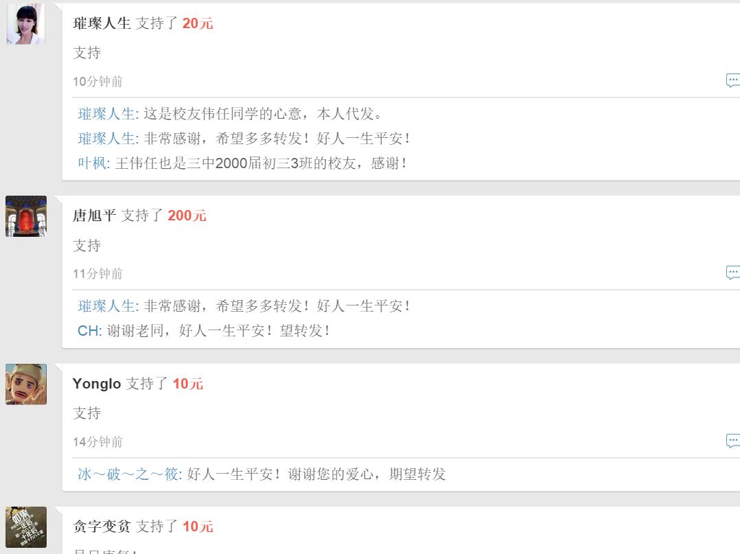 众筹平台从早上开通到现在,一共接受了五百多热心人士的捐款,暂筹资金27682.53 电白三中许多老师自发为王老师在自己朋友圈和同学群里转发,还有王旺老师曾经的学生・・・・・・以下是在众筹平台截图 人太多就不一一截了,以下是链接大家都可以进去关注一下。 http://m.qschou.com/project/4c79e852-be1f-...echat&shareto=2