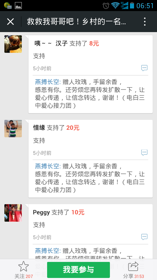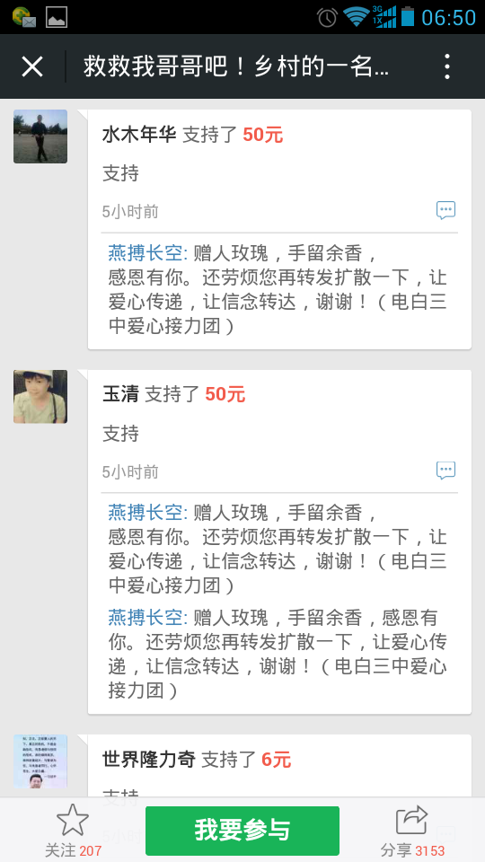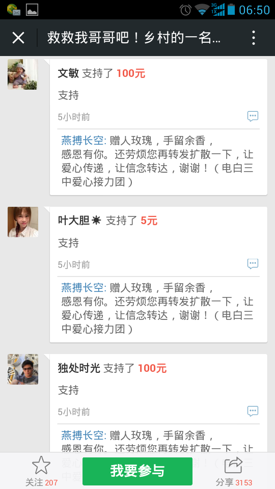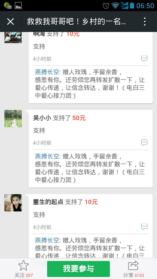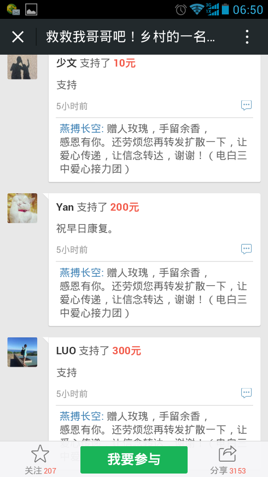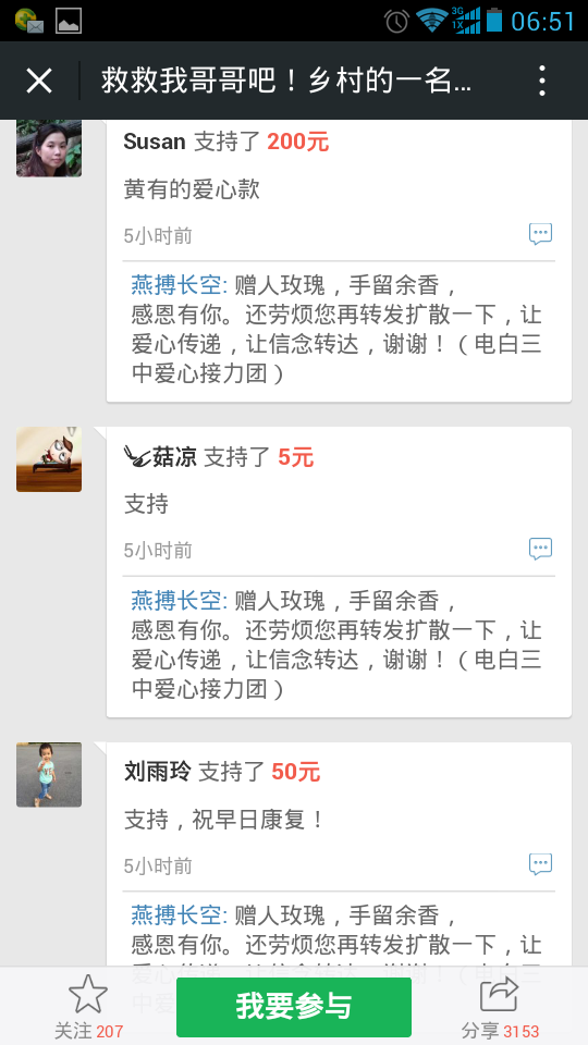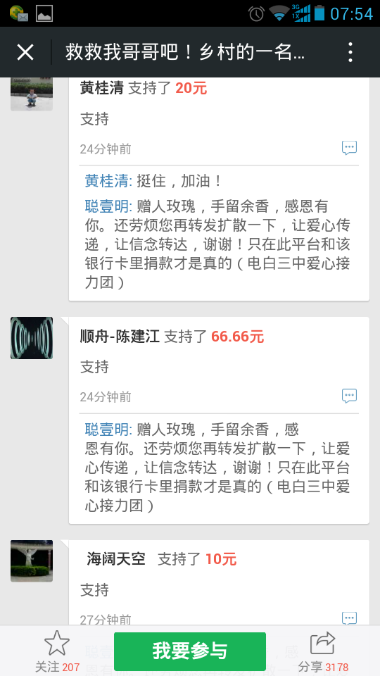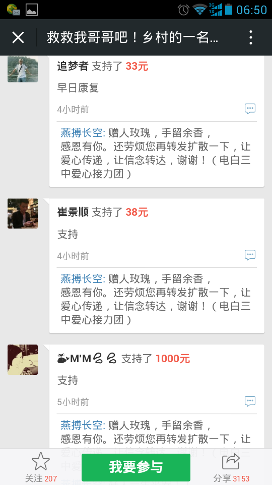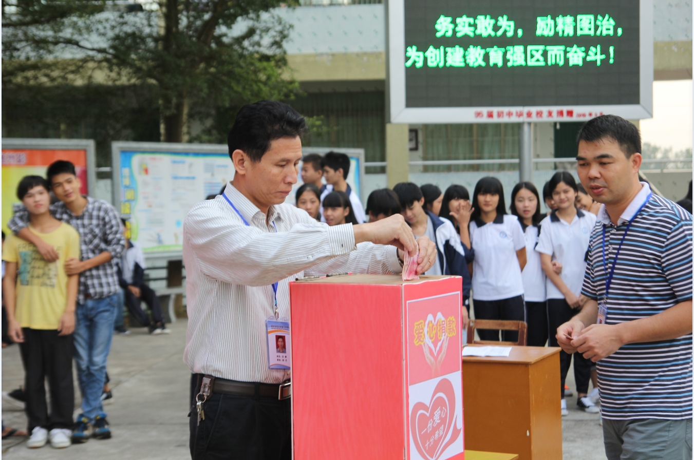 电 电白区第三中学 幼儿园 注册 2015-04-03 帖子 10 反馈评分 0 点数 0 2015-10-26 #122 电白三中工会已于今天下午5:30将收到的52985元捐款送给王旺家人。 学校的捐款活动仍在进行中,截至今晚9:30,共收到师生的捐款55172.6元。 衷心感谢社会各界人士对王旺老师的帮助! 愿王旺老师早日康复!