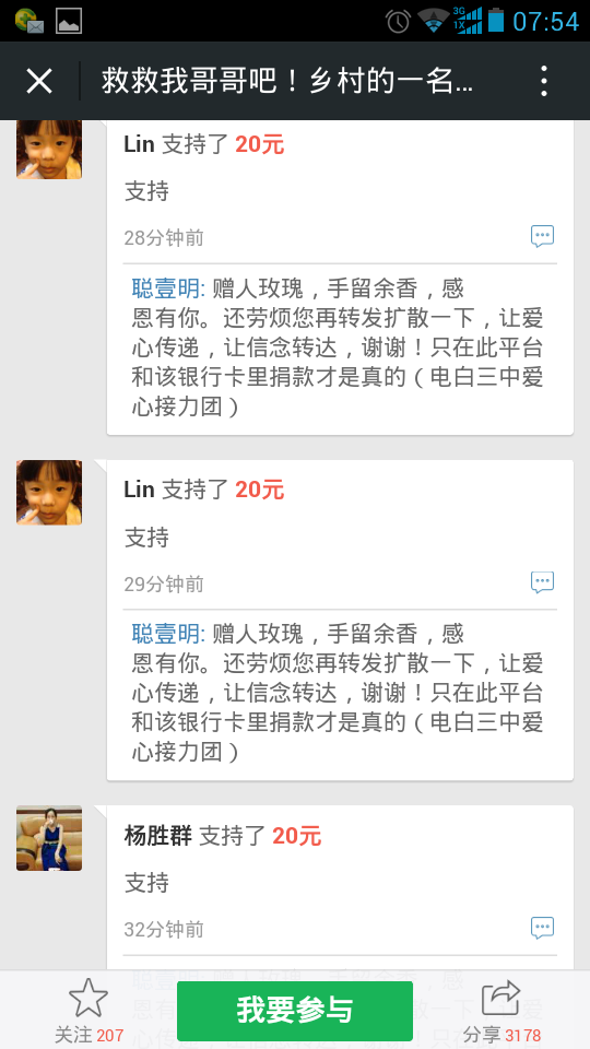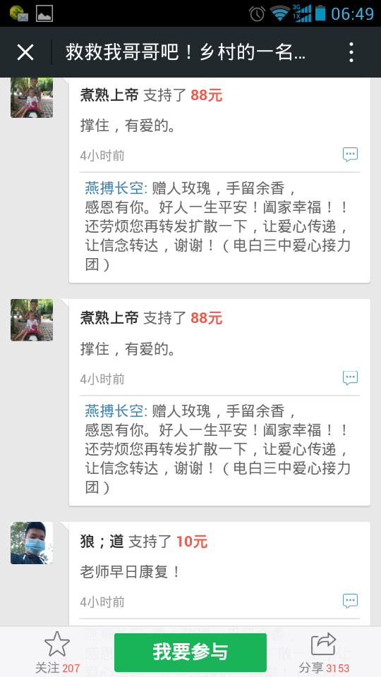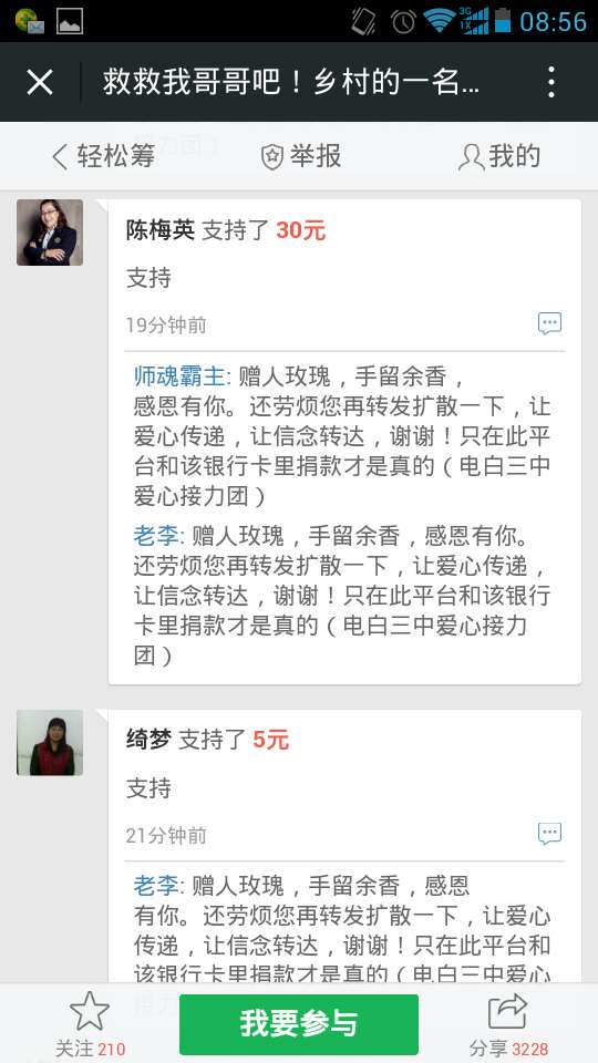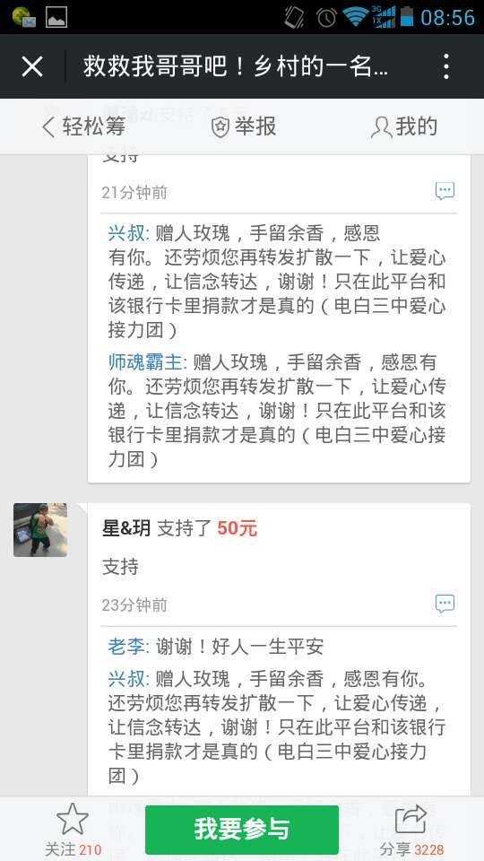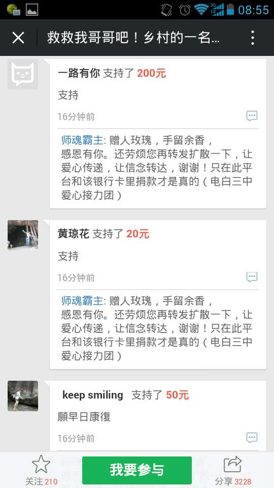 一 一点云 小学三年级 注册 2006-10-21 帖子 222 反馈评分 5 点数 1 2015-10-26 #121 爱心网友接力跑,众募平台已破13万大关!谢谢! 王旺老师的弟弟:王彩丰电话:15989870775 帐号:62170072 0002 0945 260 户名:王彩丰 中国建设银行深圳市南山支行 支付宝账户:wangcaifeng367@163.com 众募平台网址 http://www.qschou.com/project/4c79e852-be1...苯泳杩睿谢谢! 可以在手机直接点击该网址进入捐款的。 附件 1.jpg 59.3 KB · 查看: 471