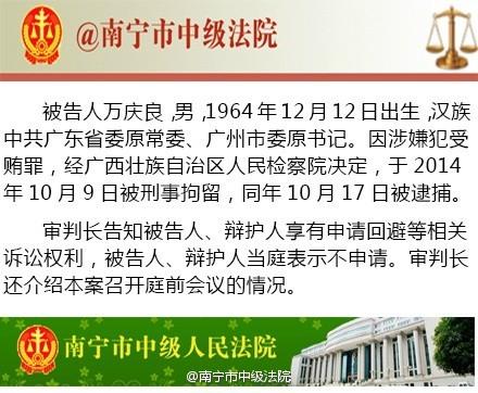 万庆良被控收受财物1.1亿 据广西壮族自治区南宁市中级人民法院官方微博@南宁市中级法院消息,广东省委原常委、广州市委原书记万庆良受贿案由广西壮族自治区南宁市中级人民法院副院长洪彪担任审判长,与审判员刘振华、韦璐明组成合议庭。2015年12月25日8时30分,审判长敲响法槌,宣布开庭 [attachmentid=347081][attachmentid=347082]