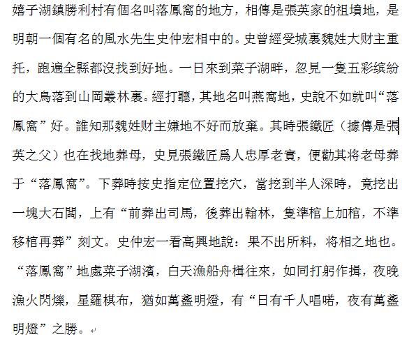 [FONT='宋]嬉子湖倮村有名叫落PC的地方,相魇英家的祖ž地,是明朝一有名的L水先生史仲宏相中的。史曾受城Y魏姓大财主重托,跑遍全h都]找到好地。一日淼讲俗雍畔,忽一b五彩缤的大B落到山擦盅Y。打,其地名叫燕C地,史f不如就叫“落PC”好。l知那魏姓财主嫌地不好而放。其rF匠(魇英之父)也在找地葬母,史F匠人忠厚老,便衿浣老母葬于“落PC”。下葬r按史指定位置挖穴,挖到半人深r,竟挖出一K大石,上有“前葬出司R,後葬出翰林,b使咨霞庸祝不室乒自僭”刻文。史仲宏一看高d地f:果不出所料,将相之地也。“落PC”地Ž菜子湖žI,白天O船舟楫往恚如同打躬作揖,夜晚O火Wq,星_棋布,q如fK明簦有“日有千人唱喏,夜有fK明”之佟。[/FONT]