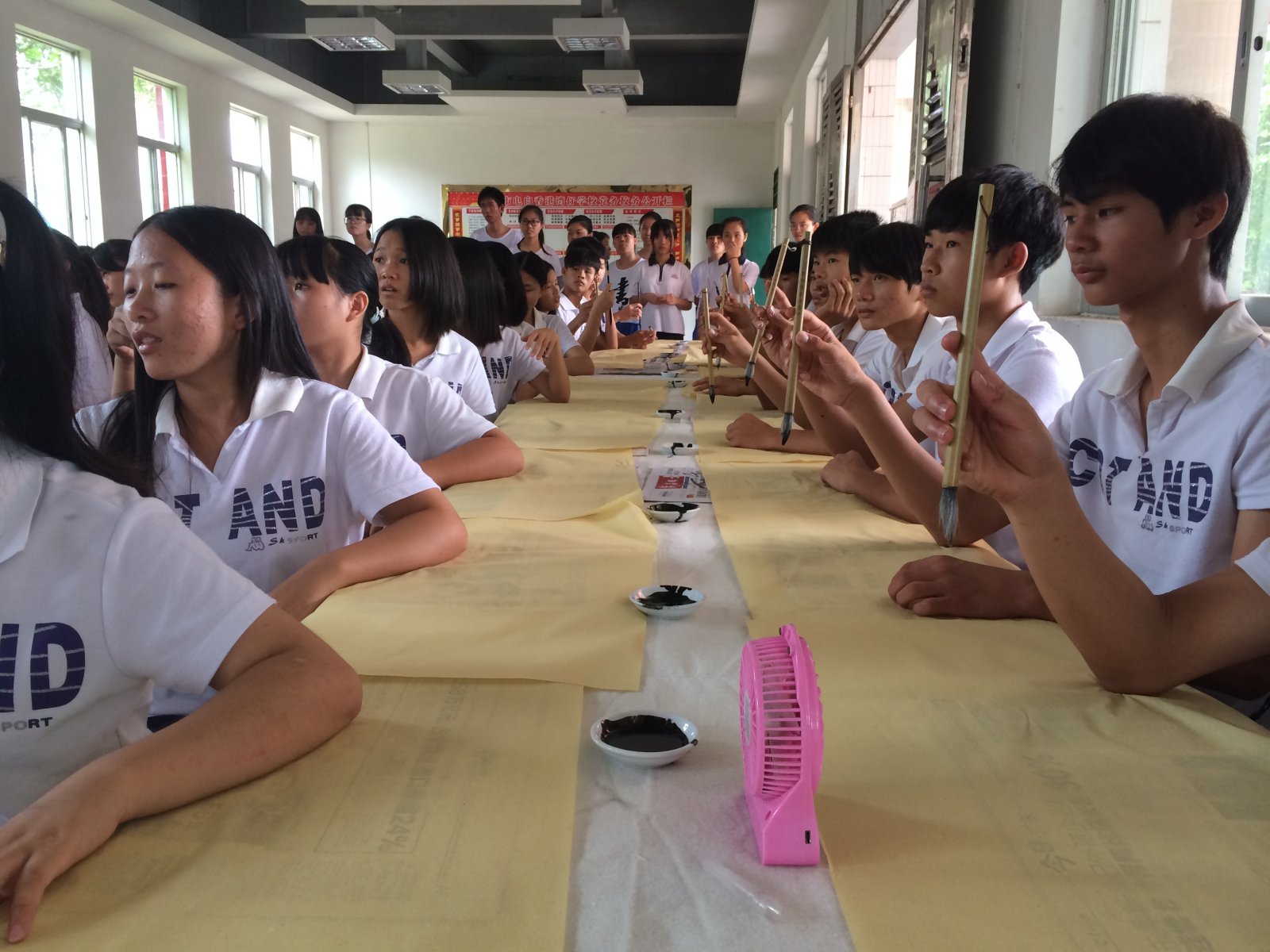 由电海中学“書華书法协会”携手大国工匠等爱心企业发起的献爱心活动——書華文化书法课堂于本本周周六早上走进电白区香港湾仔学校。书协的老师与学生带去师生们与社会各界捐赠的物品、慰问金及一批书籍等,并带去最宝贵最生动的一节第二课堂——书法课。课堂上,使用主讲老师授课,助教老师带动的教学模式,16位助教学生在四位主讲老师的带领下,第一次完成了这么大型的书法基础课程。全体湾仔小学学生共68人,他们第一次接触书法课,也是第一次有这么多老师同时授课,效果相当明显。
