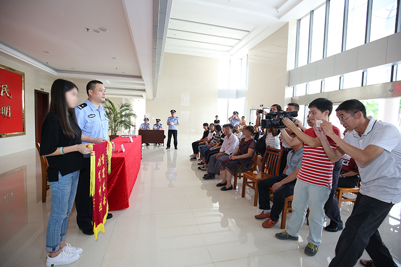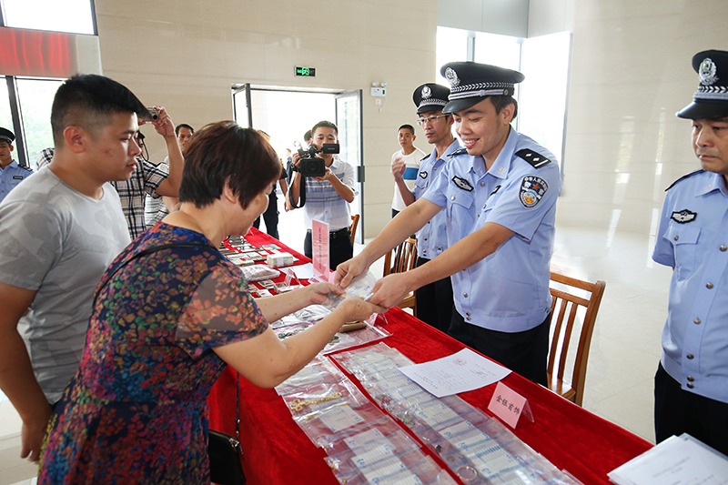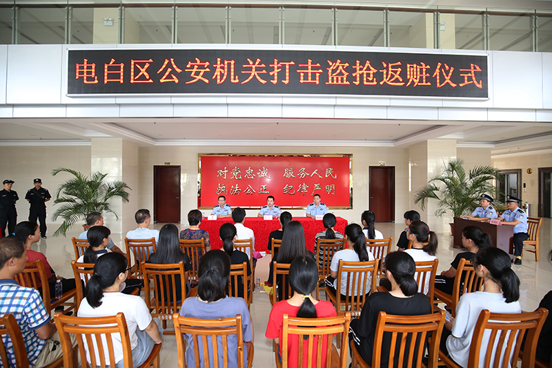 10月10日下午,电白公安分局在新办公楼大堂隆重举行打击“盗抢”犯罪返赃仪式。仪式现场,24名失主前来认领自己的物品,并为民警献上锦旗表示感谢。