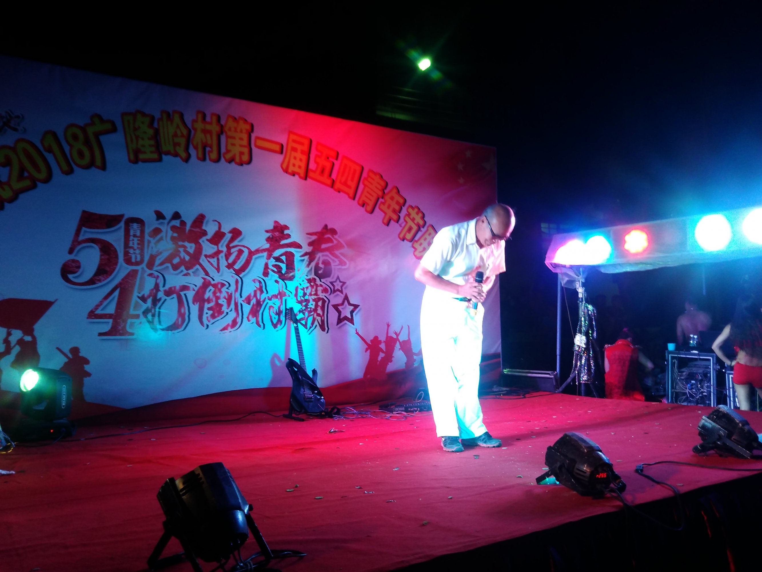 自从广隆岭村打击村霸以来,多得村中大部分后生仔们出谋献策,出钱又出力。为此,广隆岭村决定举办一场五四青年活动,这也是本村历史以来首届五四青年节。消息刚传开时,村民们就纷纷表示支持,开始踊跃出钱出物,还有赞助酒水和烧猪…,这天也恰巧是广隆岭村祭拜郑氏祖先的日子,飞马郑氏祖先长房当年迁居至水东镇广隆岭,如今儿孙已传承至二十七世,甚至可能还有些幼辈我不知道的…。5月4日,其中部分年轻人去参与祭拜祖先活动,留出部分人在村中为青年节忙前忙后。之前由于村中没有合适场地搞五四青年活动,从5月1日开始,村民就开始分工合作,决定在村边荒地开垦出一个小型“文化广场”。由于资金有限,活动安排一切从简,将最小资金最大化利用。整个活动搞的有模有样,还请了舞台乐队唱歌表演,村民们其乐融融。村委成员借此活动上台宣誓,从来没有过这样的仪式感。他们长期顶着巨大黑恶势力压迫,还能比如斗志昂扬,他们的无私奋献精神很让人感动。打击村霸恶势力,就要重拳出击,就应该斗争到底。