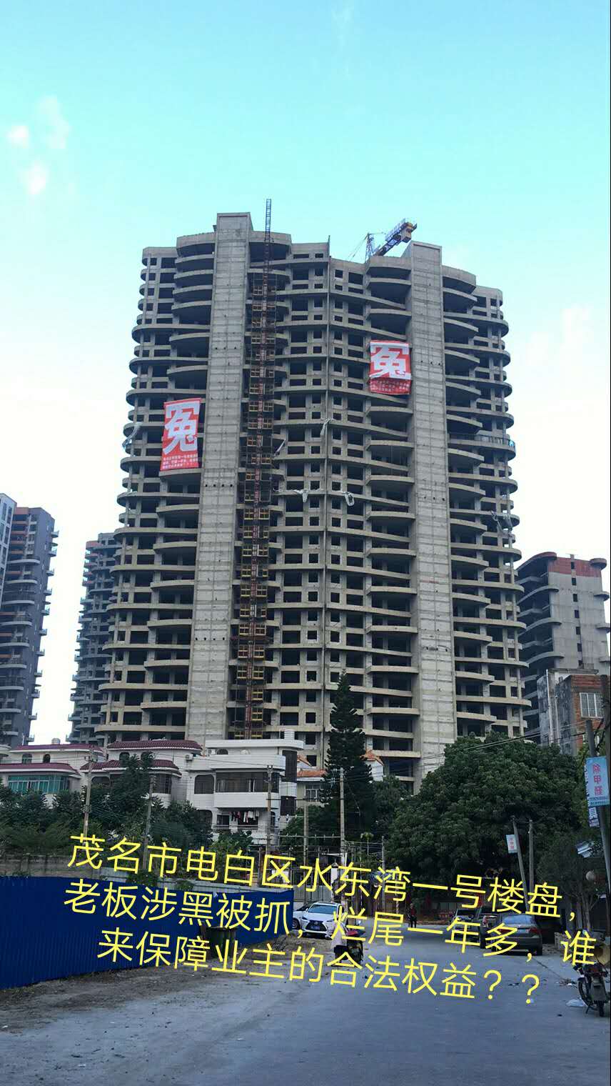 2017年10月1日在茂名市电白区水东镇水东湾一号购买了一套5证提前的商品房。原定于2019年12月30日前交房,由于楼盘老板涉黑被抓,楼盘之金钱不冻结,导致现在楼盘前面停工烂尾,不能按时交房,业主沦落街头无家可归。业主4问:1.既然是五证齐全,住建局和政府相关部门为什么不出来解决问题,而是一直在逃避????2.全部业主的钱来源于合法为何也遭遇冻结,而不用于楼盘建设???3.这个涉黑案件至今已经一年多,为何高州市公安局迟迟不能结案????4.业主真金白银买的楼房,相关部门怎样保障业主的合法权益不受侵害???营销中心被封,所有老板被抓,资金冻结!