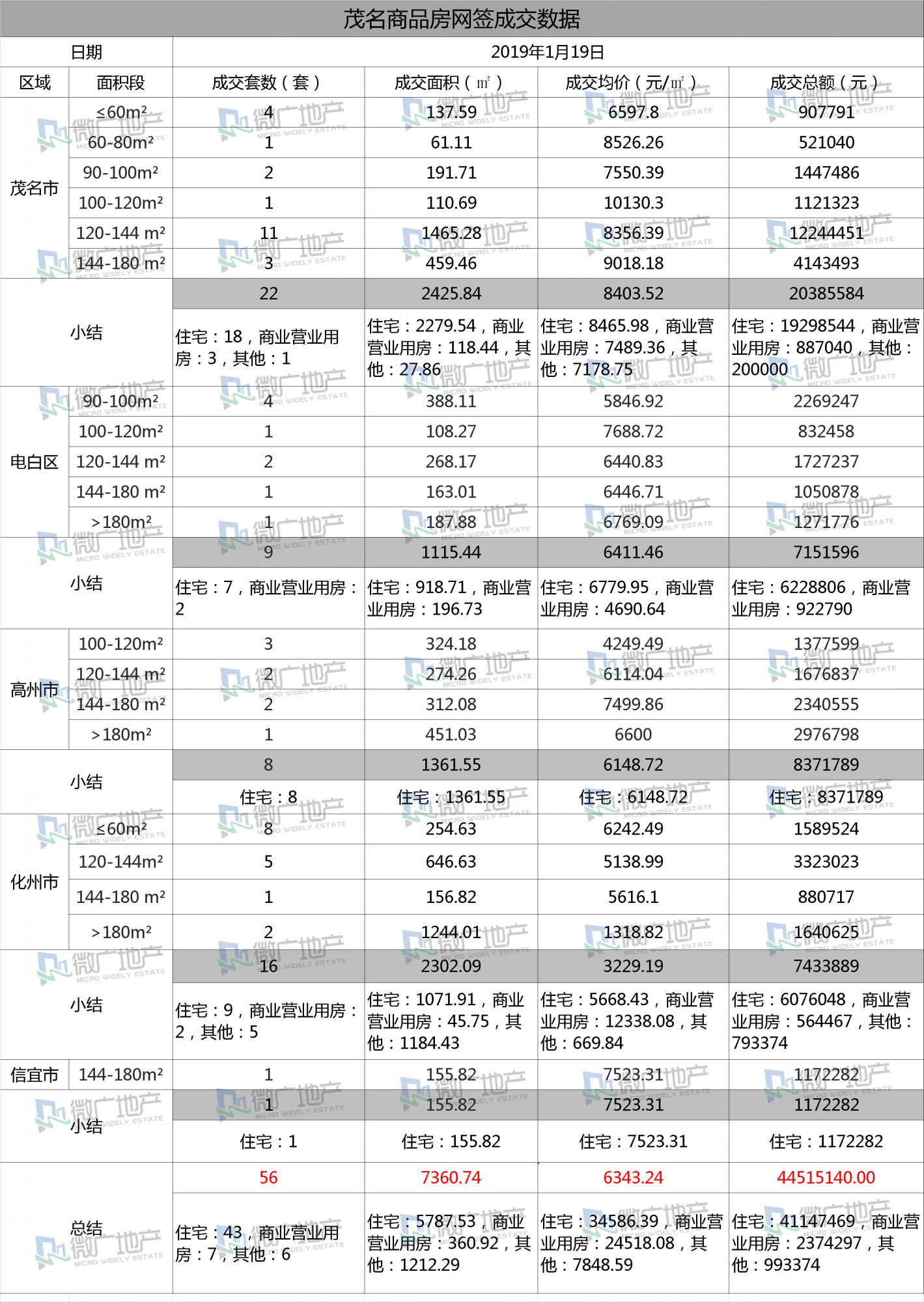 分享 2019年1月19日,茂名商品房网签56套,均价为6343.24元/㎡,总额约4.4千万元