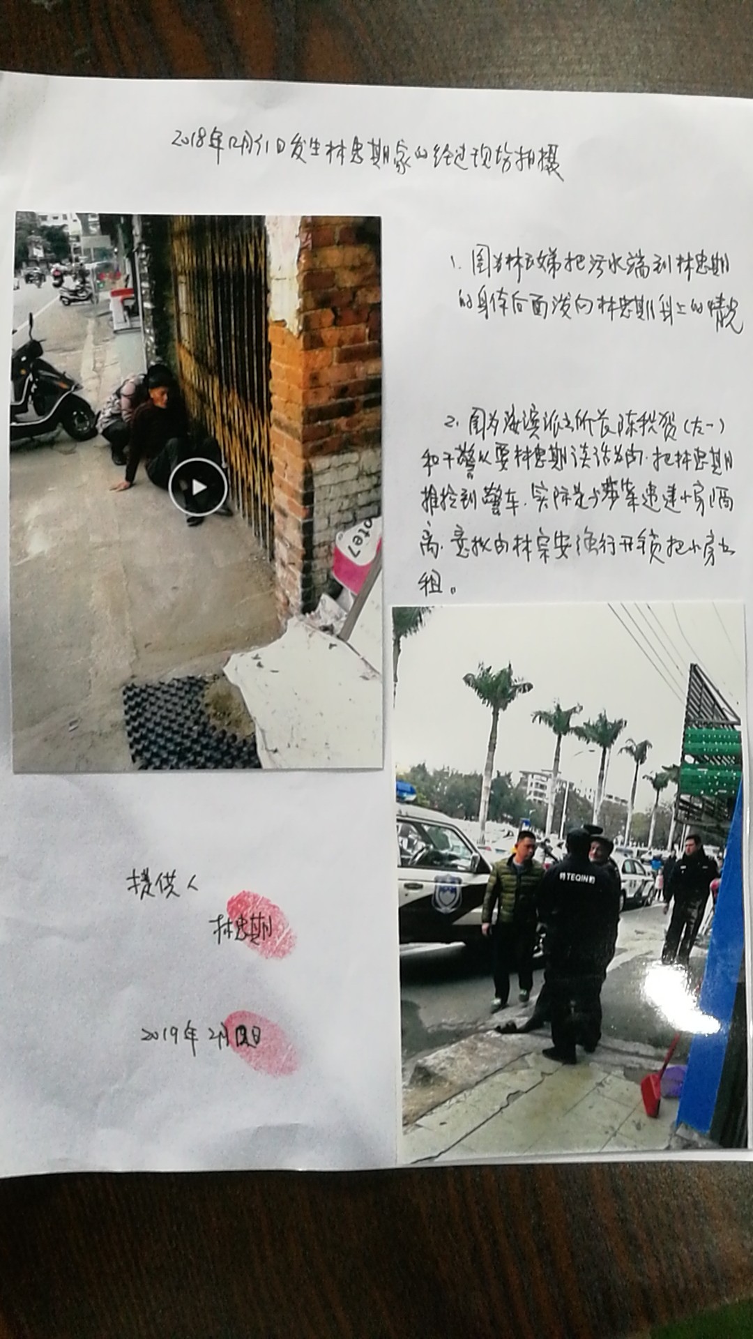 2018年12月30日,海滨所长陈积贺带着十几个人把我抓上警车,让林宗安、黄胜来等人跑上我家把我的锅碗盆瓢全都打烂,接着陈积贺指挥林宗安等人拆掉封锁铁链,打开店门,让承租者摆放水果做生意。眼见他们占领了那间违建店铺,陈积贺才把我放下车,我前去阻止他们的恶行,被林宗安和他的姐妹林玉娣、林玉芬、林玉凤以及妹夫黄胜来、梁必成等人围攻,他们拖打我,林玉芬还找来铁锤敲打我的手背,我浑身是伤,手背鲜血直流。那晚天气寒冷,他们还用冷水浇湿我的衣服,又冷又受伤的我在寒风中瑟瑟发抖。被他们折磨了好久,儿媳哭着给我端来热粥被他们踹掉了,接着又给我拿两个热馒头还是被他们抢去扔在地上。后来,城管部门派了人来,他当场指出派出所这样做是不对的,既是城管部门封锁的违建店铺,派出所无权开封,更加不能进行经营行为。但是陈积贺根本没有理会他,见林宗安等人已经成功抢占店铺,他就收队走人了。现在,那间店铺一直在经营。