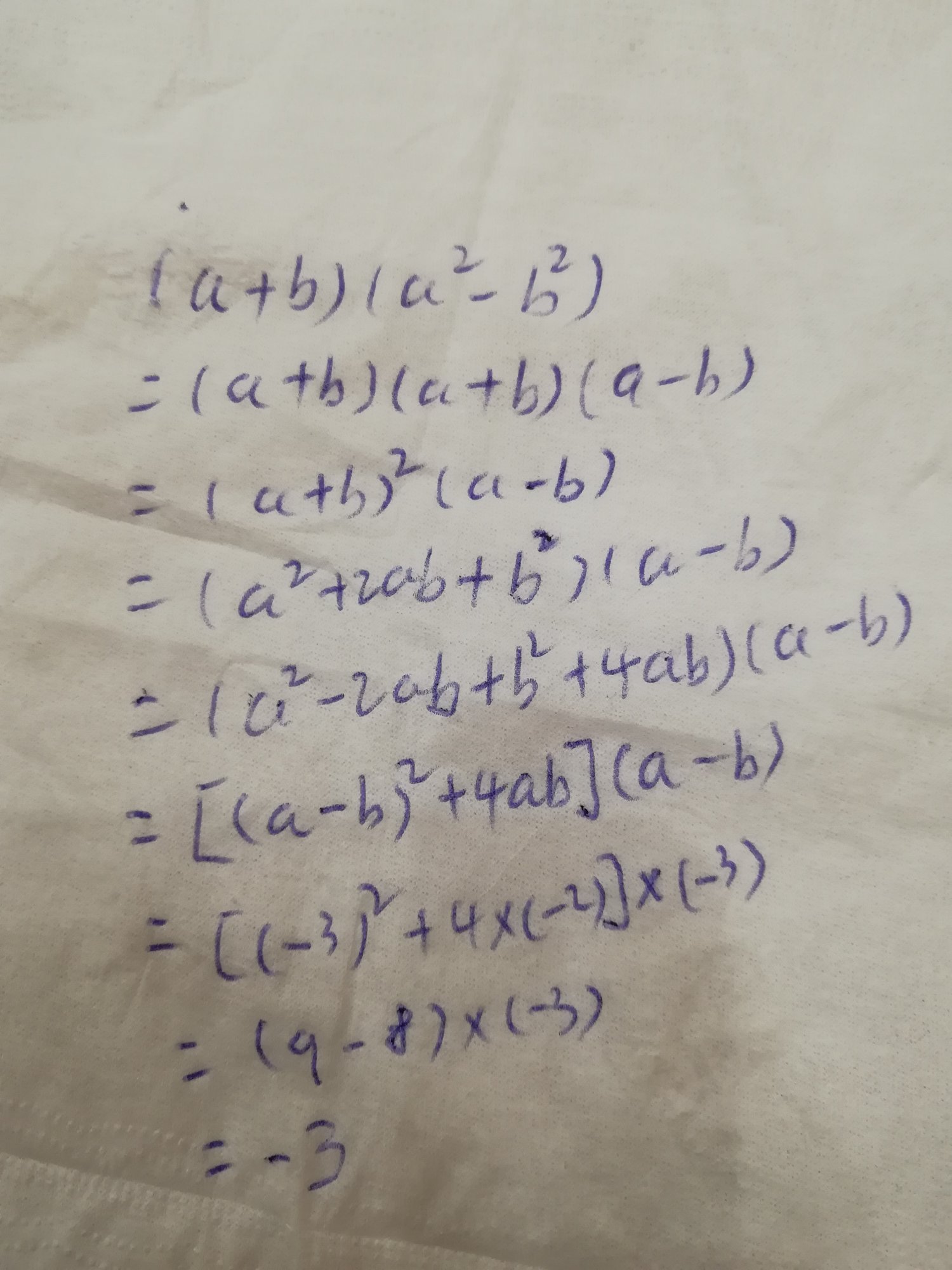 已知a-b=-3,ab=-2,求(a+b)(a[FONT=宋体]2[/FONT]-b[FONT=宋体]2[/FONT])的值。