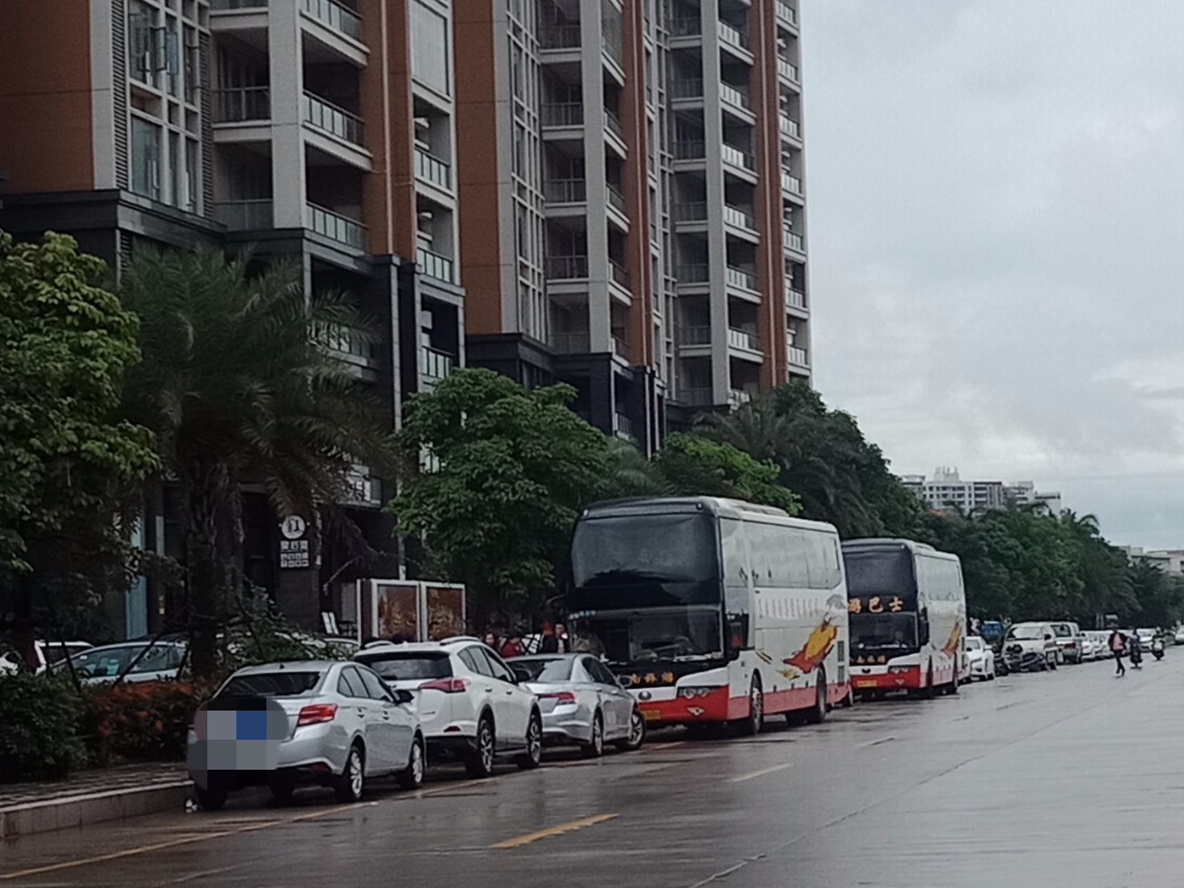 今晚下着雨,海堤路有旅游大巴的到来~