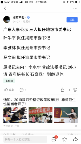 2017年6月后,任中共潮州市委书记,市人大常委会党组书记、主任候选人;