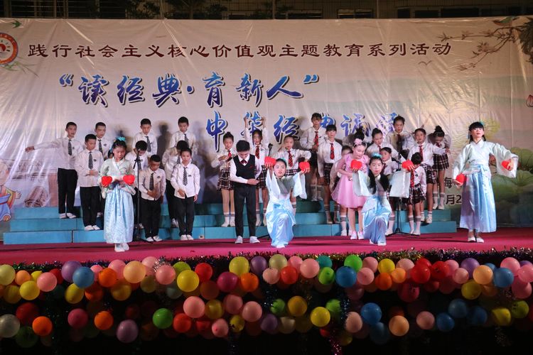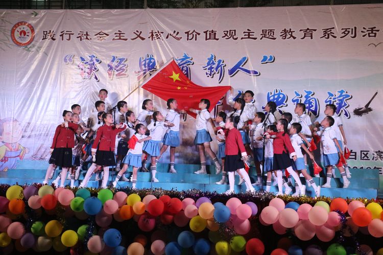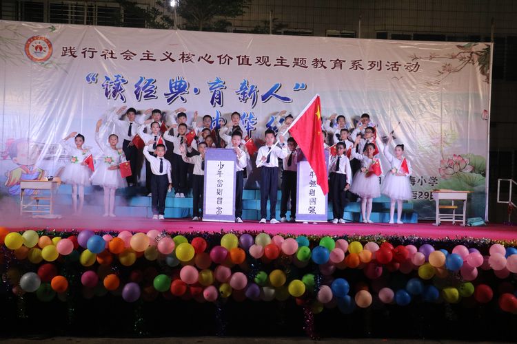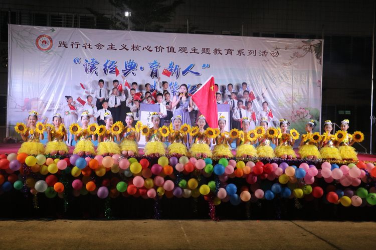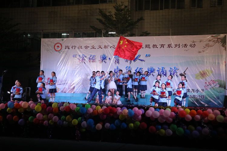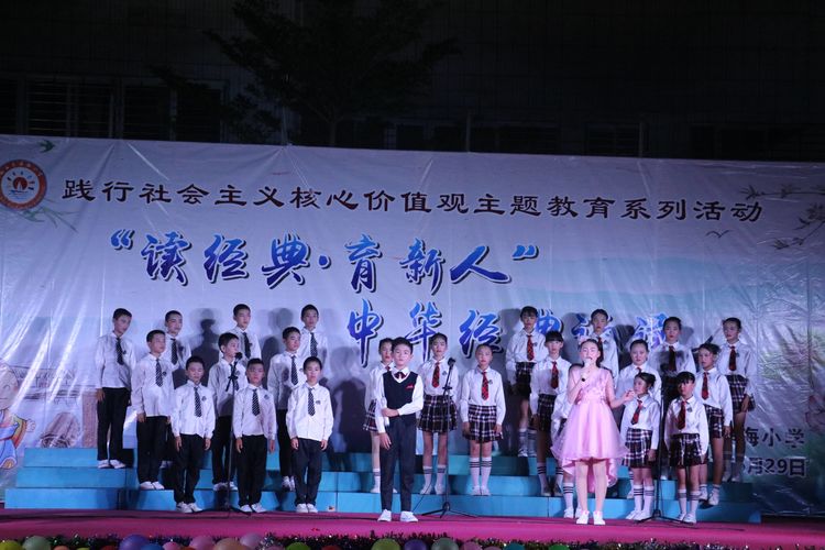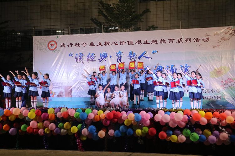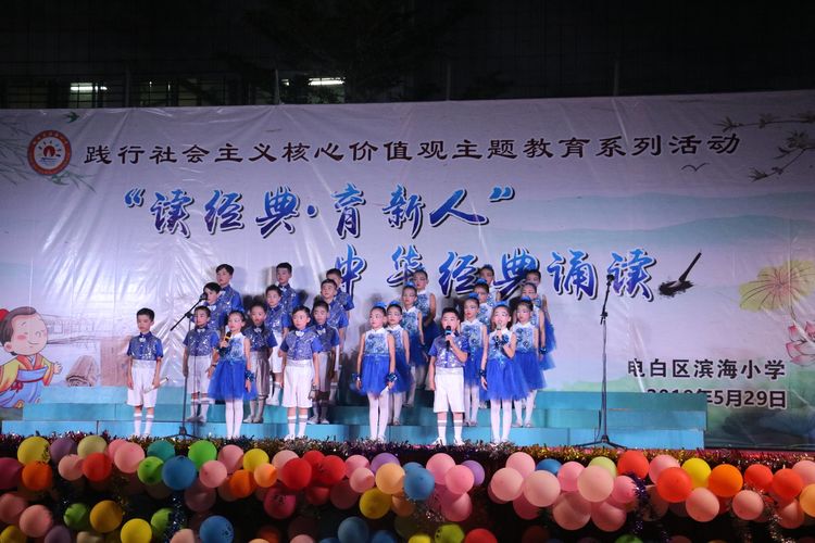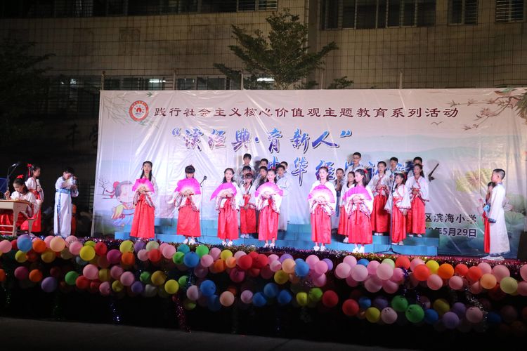 中国文化源远流长,博大精深。中华经典经久不衰,启迪智慧。为弘扬中华传统文化,践行社会主义核心价值观,庆祝“六·一”国际儿童节,2019年5月29日(周三)晚,电白区滨海小学举行了“‘读经典·育新人’中华经典诵读”晚会。电白区教育局党组成员、副局长唐少安同志,南海街道办副主任蔡玉娟同志,电白区教育局德育股股长陆小燕同志,南海街道霞里社区书记蔡标强同志,霞里社区领导干部等莅临指导。