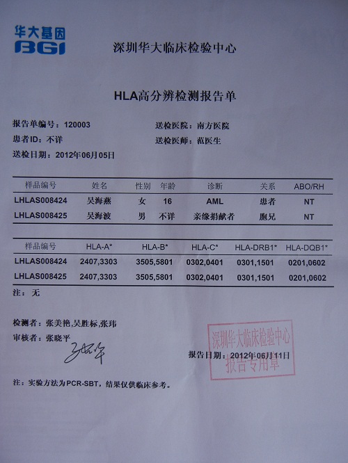 水 水东吴海波 小学二年级 注册 2012-05-04 消息 180 反馈评分 0 点数 0 2012-06-25 #183 很幸运和妹妹的骨髓配对成功,但接下来还需要约50万元的费用(2个化疗(10万),骨髓移植手术(30万),移植后加强治疗(10万)!我跪求大家在家庭经济允许的情况下,慷慨解囊,你们的每一份支持都在传递一份生命的热度,使海燕生命得到延续,让生命之花再度绽放! [attachmentid=296776] 附件 骨髓配对结果1.jpg 115.1 KB · 查看: 455