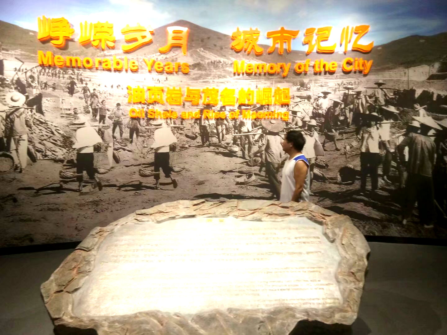 这幅照片主标题是“峥嵘岁月,城市记忆”,副标题是“油页岩与茂名的崛起”,背景照片是广大民工在挑高州水库,博物馆名称又是“茂名市露天矿博物馆”,感觉是不太搭界……