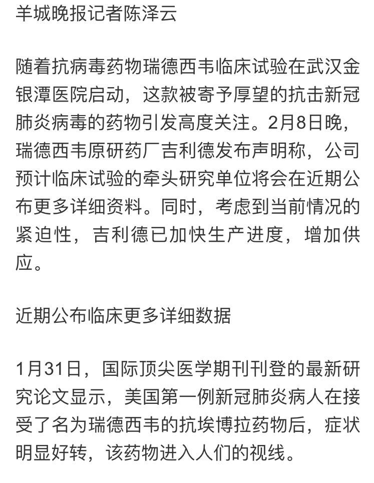 美国吉利德科学公司研发的药品瑞德西韦在武汉进入临床试验,无偿提供研究所需的药物