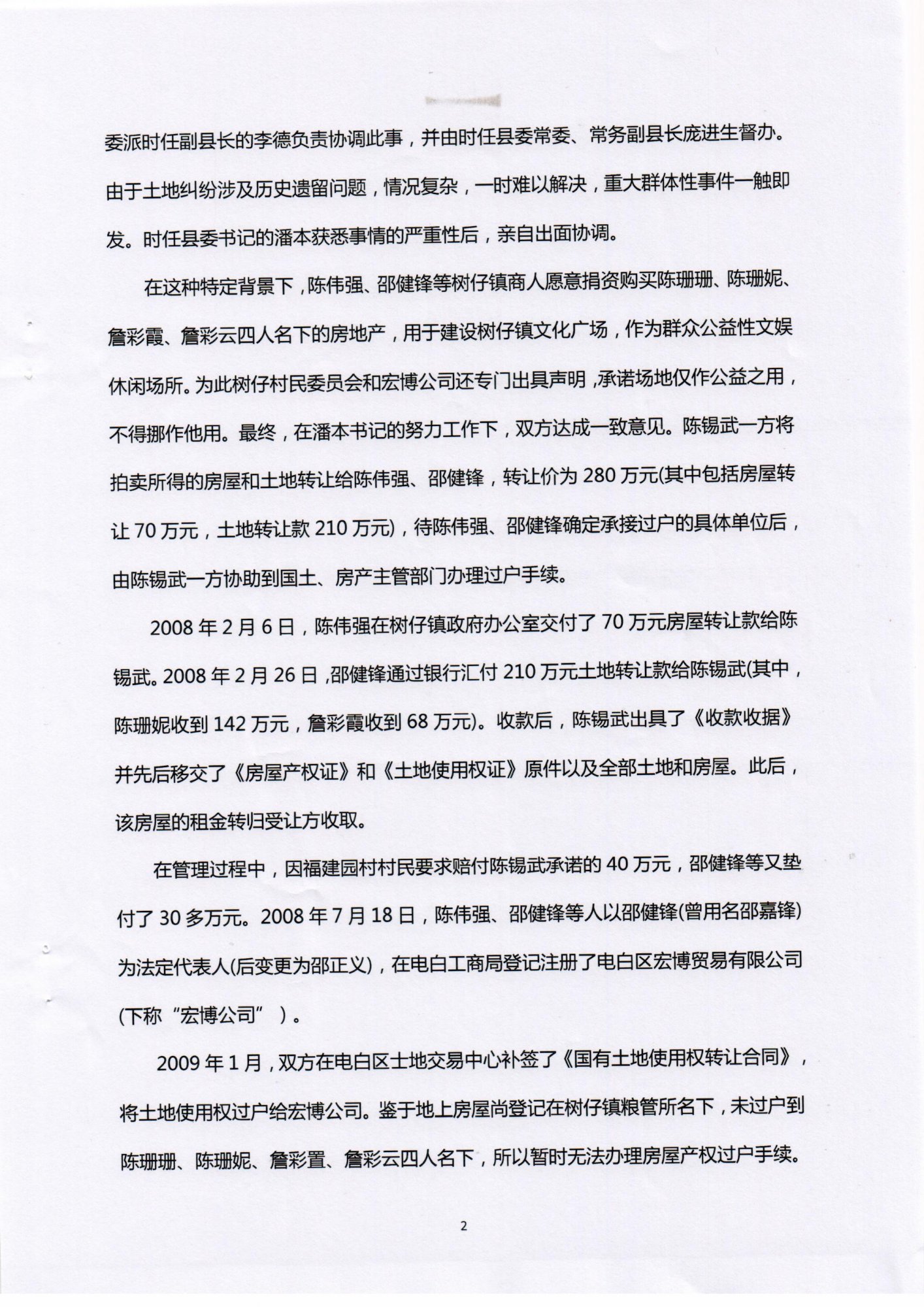 在这种特定背景下,陈伟强、邵健锋等树仔镇商人愿意捐资购买陈珊珊、陈珊妮、詹彩霞、詹彩云四人名下的房地产,用于建设树仔镇文化广场,作为群众公益性文娱休闲场所。为此树仔村民委员会和宏博公司还专门出具声明,承诺场地仅作公益之用,不得挪作他用。最终,在潘本书记的努力工作下,双方达成一致意见。陈锡武一方将拍卖所得的房屋和土地转让给陈伟强、邵健锋,转让价为280万元(其中包括房屋转让70万元,土地转让款210万元),待陈伟强、邵健锋确定承接过户的具体单位后,由陈锡武一方协助到国土、房产主管部门办理过户手续。
