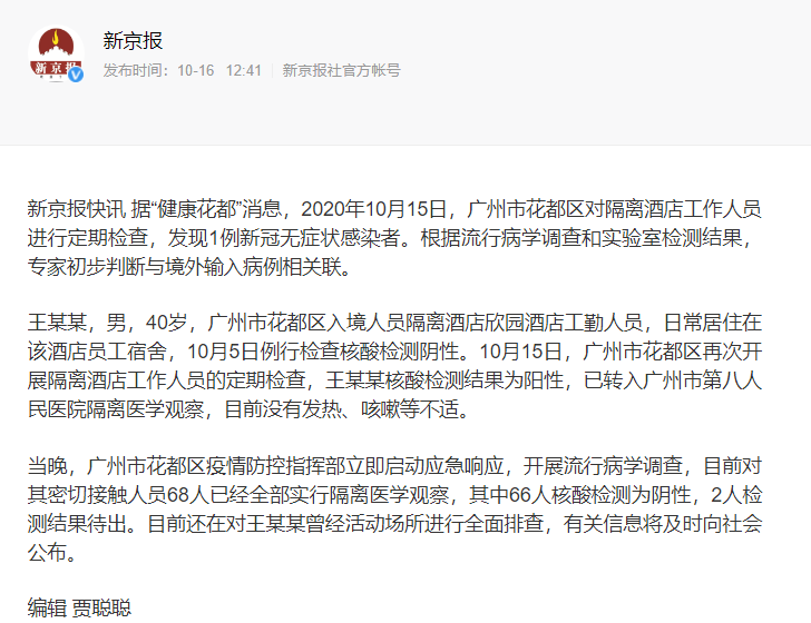 新京报快讯 据“健康花都”消息,2020年10月15日,广州市花都区对隔离酒店工作人员进行定期检查,发现1例新冠无症状感染者。根据流行病学调查和实验室检测结果,专家初步判断与境外输入病例相关联。
