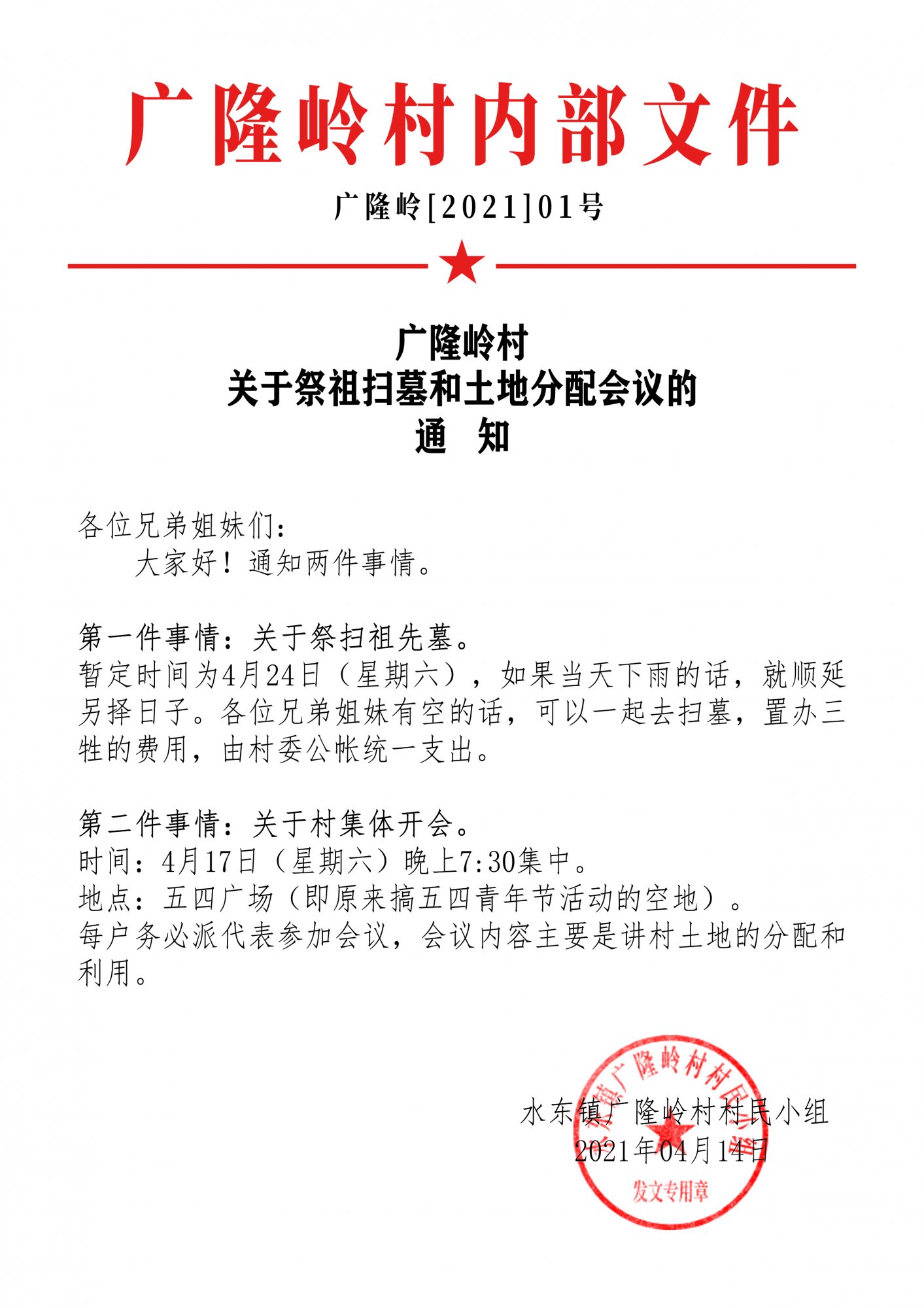 你好!那天晚上会议就讲了公告上的两大内容。一是扫村祖墓的计划安排,二是讲在村内的一处集体宅基地用集装箱搭建临时村委会做办公点,征求村民投票意见。再个就计划把广隆岭村的大村口(人民路边)的一处空地用于出租让集体获益,免得荒废被私人占用浪费。这块空地原本是村公厕,自从被“三清三拆”政策拆下后,政府并没出资对此进行重建,别村公厕都重建得干净漂亮的。