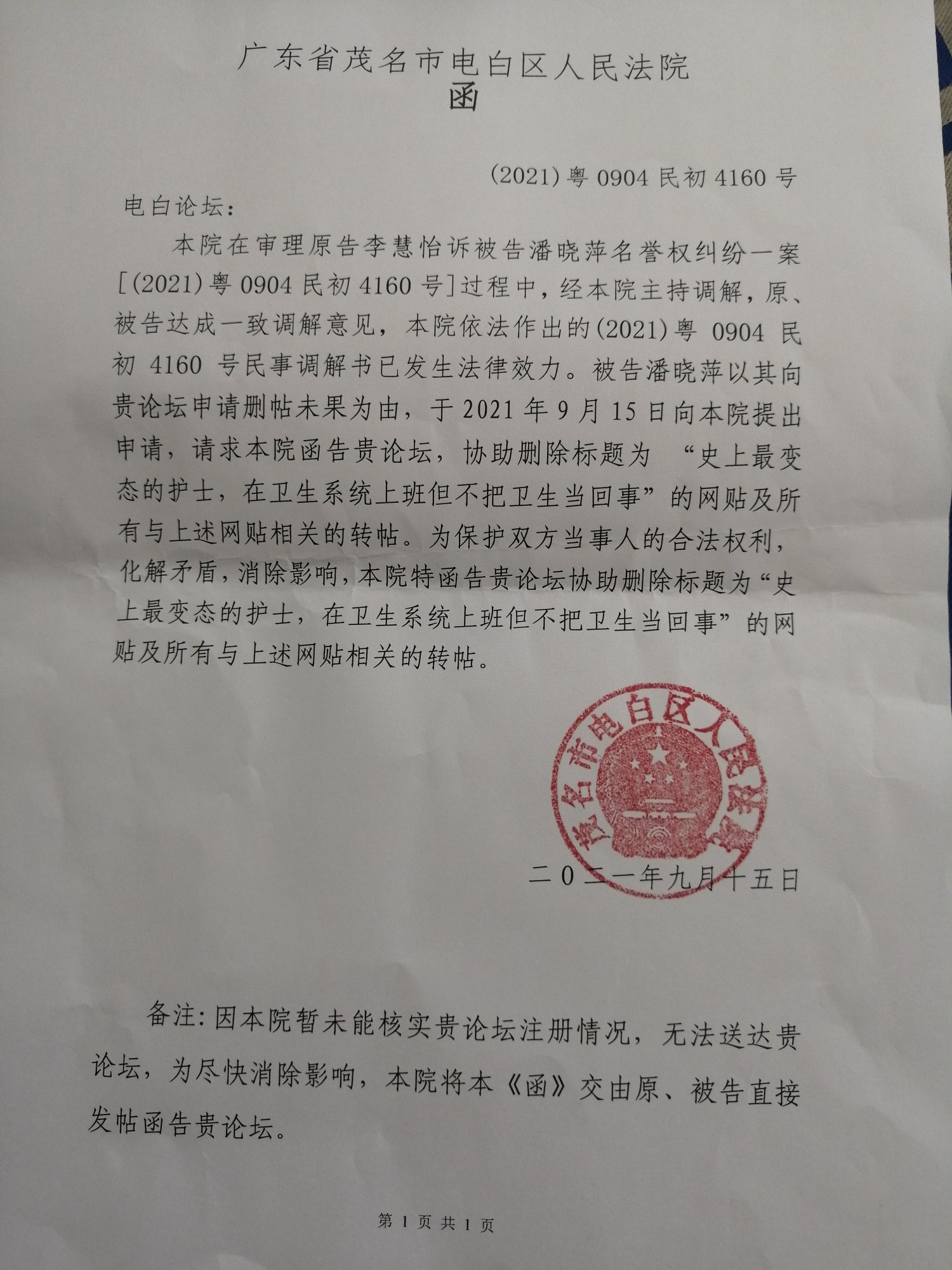 求助 电白区人民法院请贵论坛删贴函