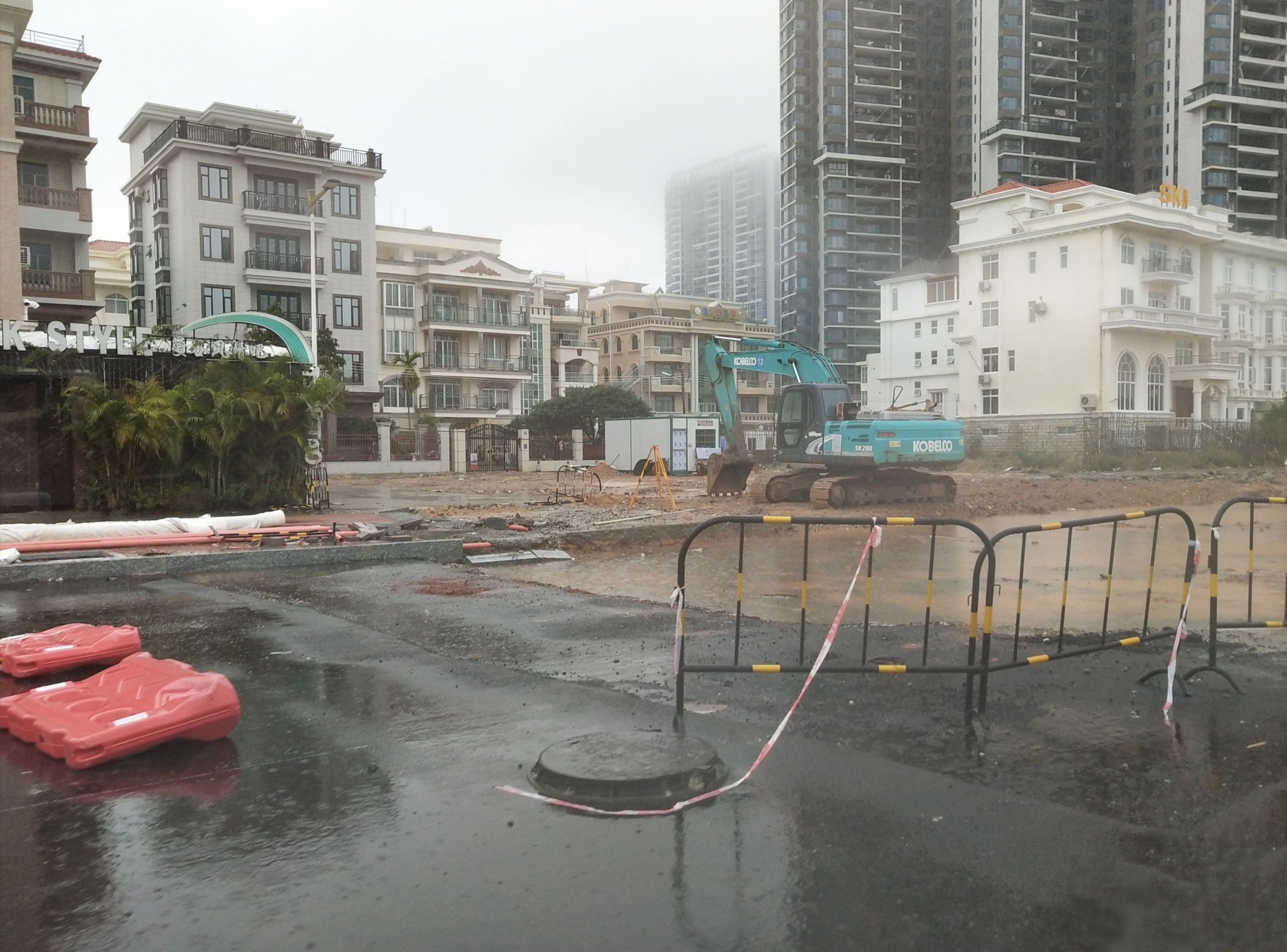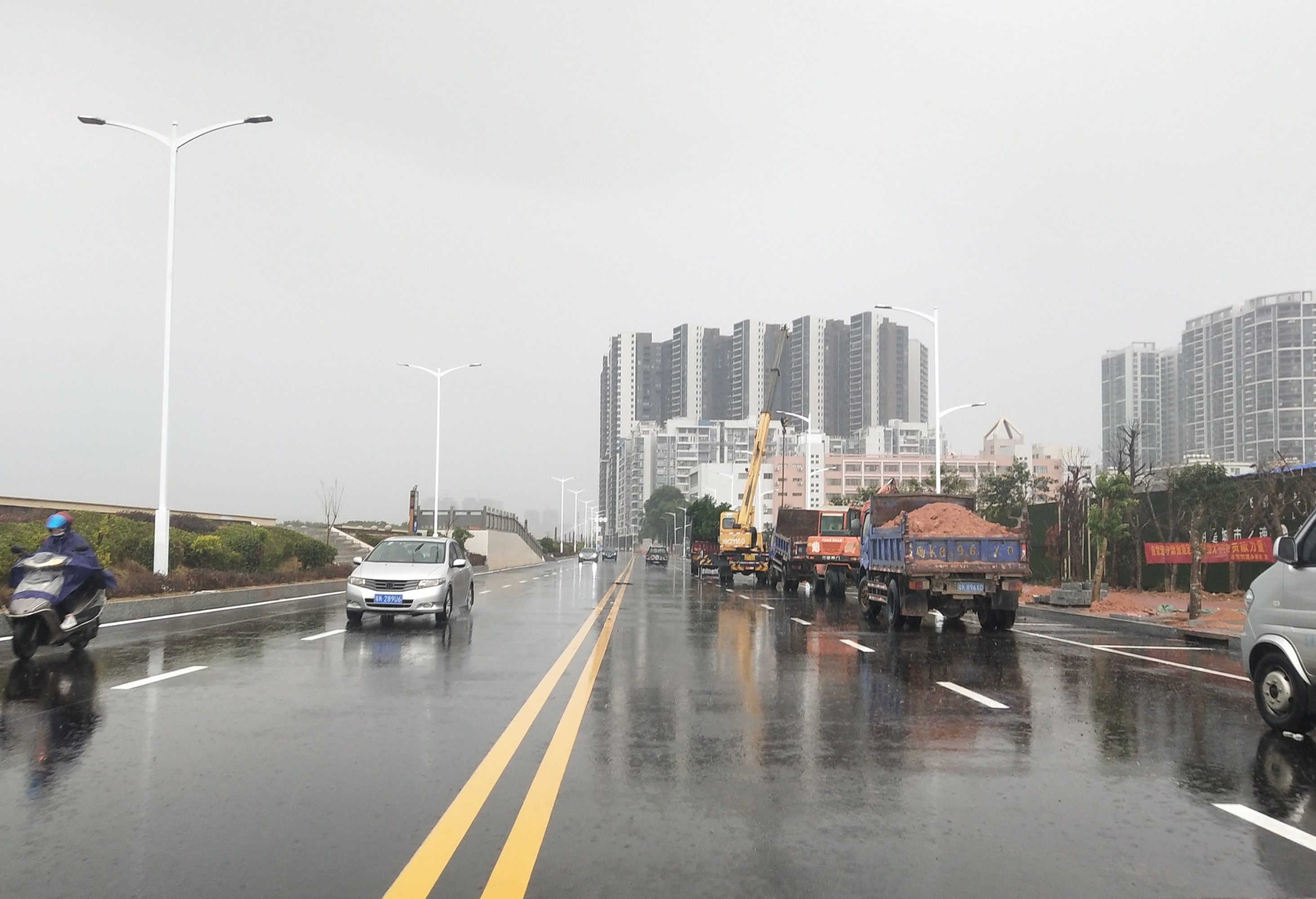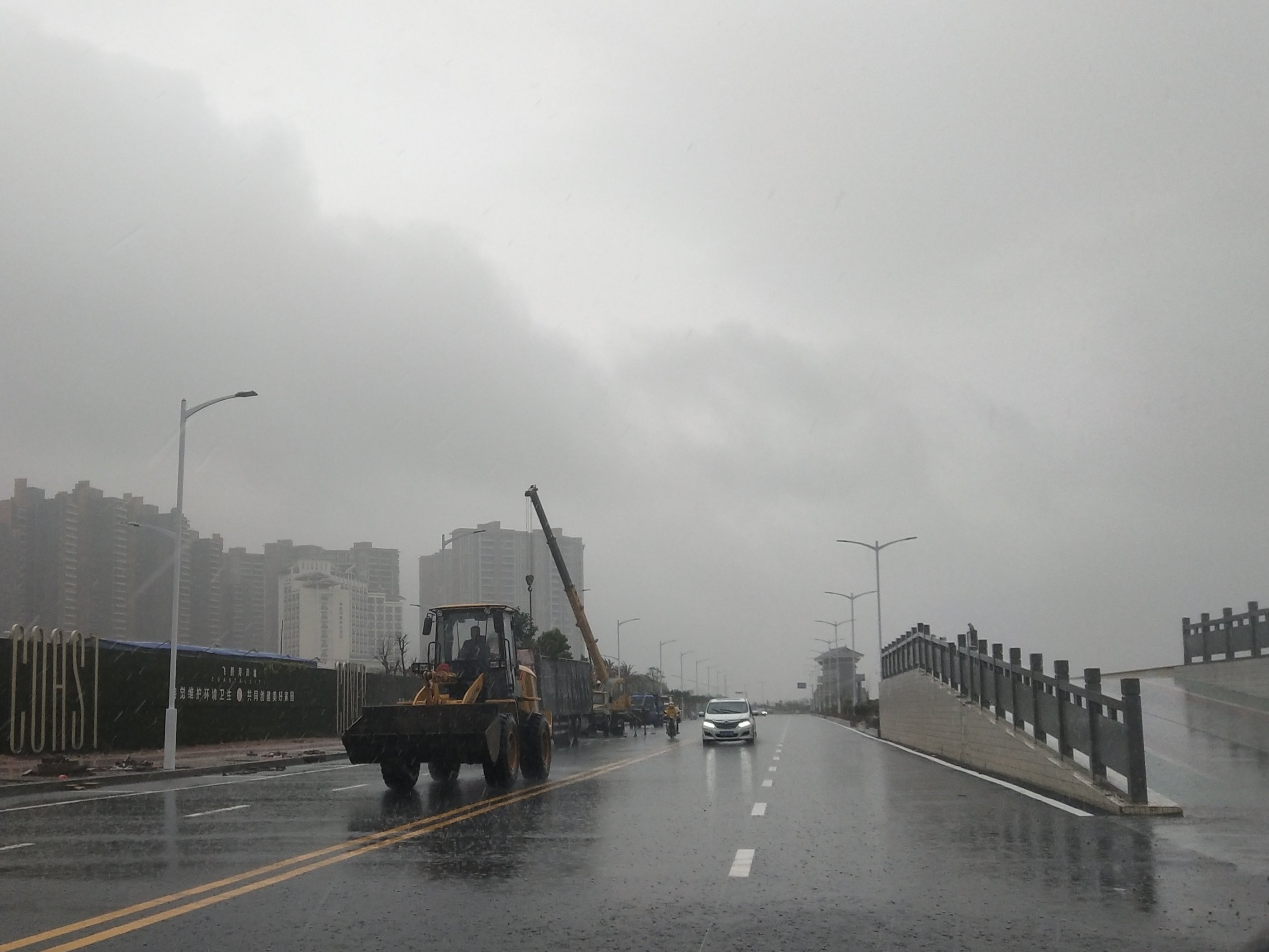 去看了下,是下了好大雨,还在持续,有些地方有浅雨水泡了,但好像暂时没见海堤路有水泡现像?以前有些地段像有水泡现像的?虽下大雨,而那些施工的机械工人等依然好像风雨不阻,而在那拆迁平整的地方,工程车像也没撤场,像有驾驶员还坐在挖掘机内,不过暂时不启动机械、、