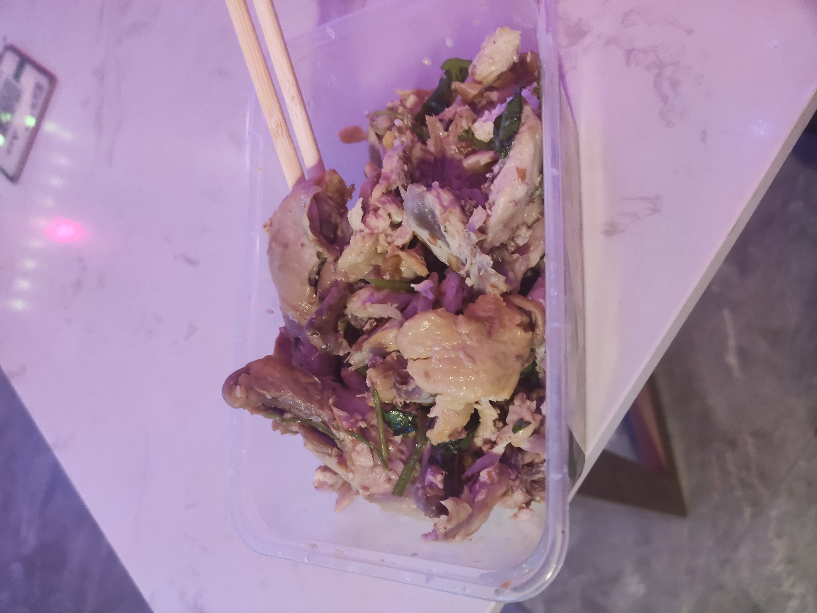 那个手撕鸡是用那种透明的一次性饭盒装的,吃的时候才发现变味,闻起来才发现臭的