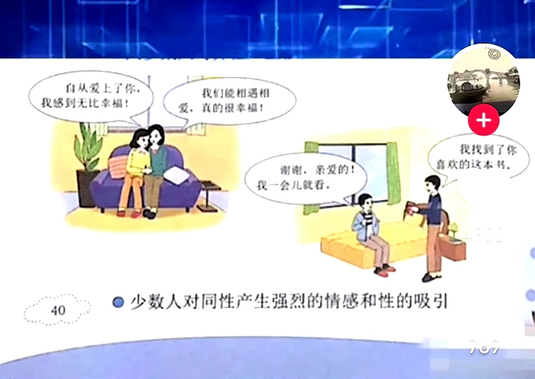 丢卡奶,国家的教科书,竟然向我们的中小学生鼓吹同性恋,鼓吹不结婚不生育丁克,鼓吹青少年性交,这是什么世界啦,不怕下雨天,天黑打雷啦。
