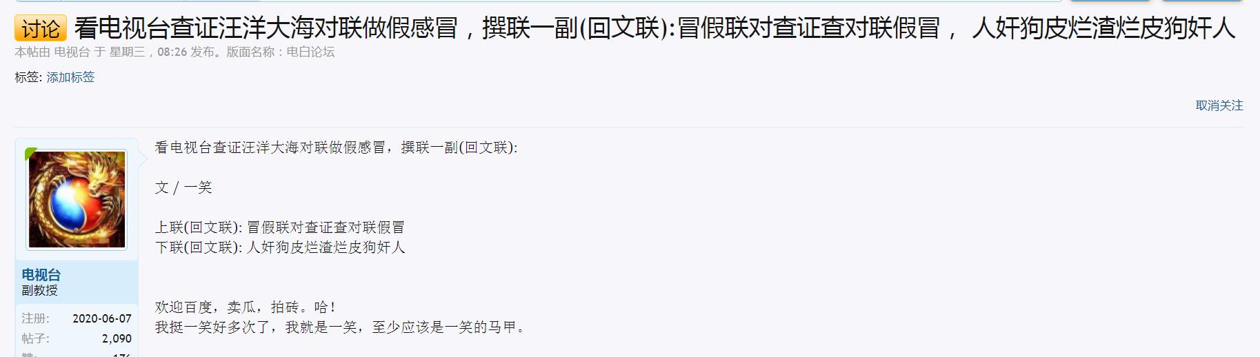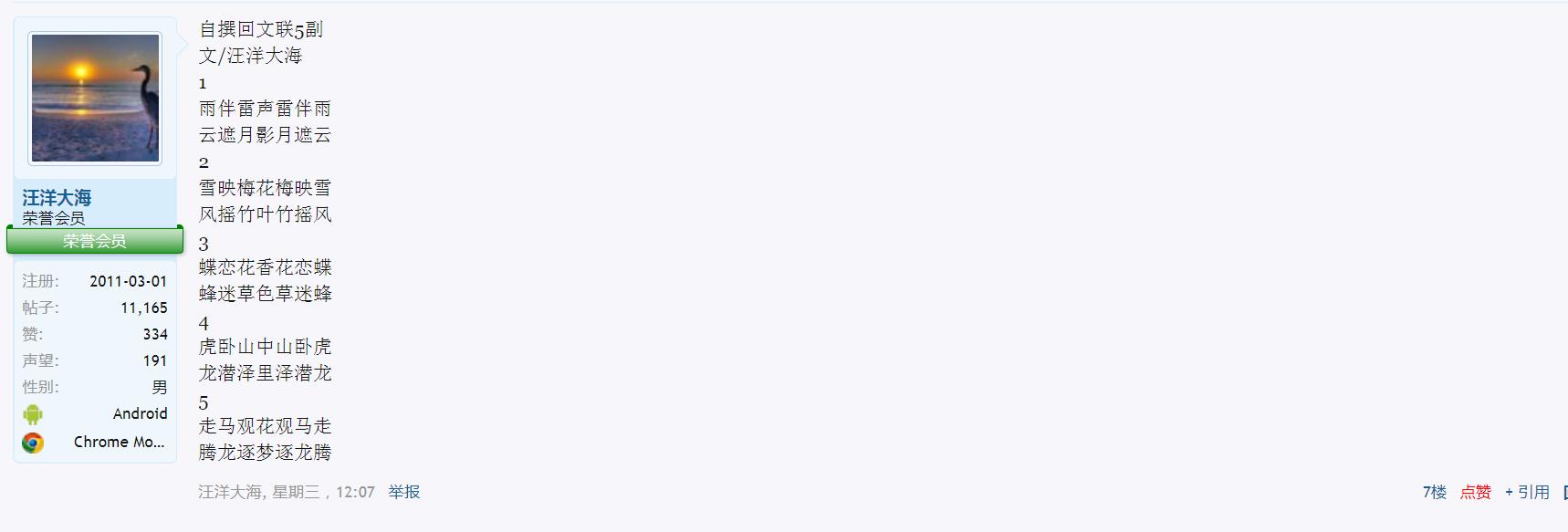 汪洋大海把别人的对联改一改就可以发上来,这是你的老套路吧?但是这一次是回文联是改不了啦,把别人在2015,2017,2018,2019年的已经在互联网发表的对联全部偷过来,你就照搬发上电白论坛,真够很哦!相信这次白纸黑字你抵赖不了啦,在电白论坛我算大开眼界!