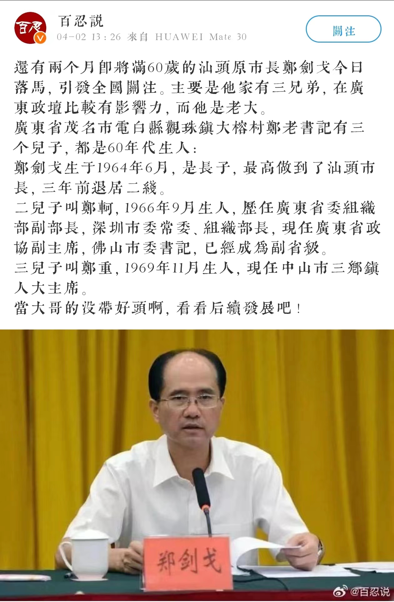 电白教师同盟会 说: 浏览附件368790浏览附件368791 点击展开... 里面有部分内容不真实,老郑不止三个儿子,是五个,影响力大的也只有两个儿子,另一个只是科级干部,说不上在广东政坛有多大影响。