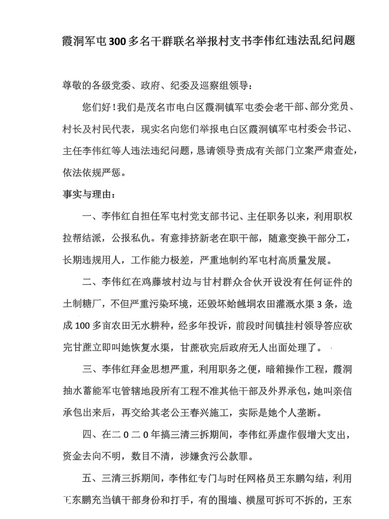 您们好!我们是茂名市电白区霞洞镇军屯委会老干部、部分党员、村长及村民代表,现实名向您们举报电白区霞洞镇军屯村委会书记、主任李伟红等人违法违纪问题,恳请领导责成有关部门立案严肃查处,