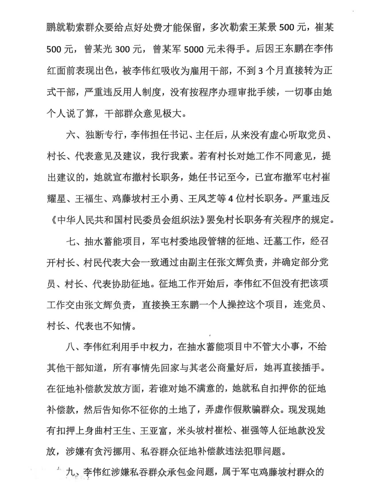 七、抽水蓄能项目,军屯村委地段管辖的征地、迁墓工作,经召开村长、村民代表大会一致通过由副主任张文辉负责,并确定部分党员、村长、代表协助征地。征地工作开始后,李伟红不但没有把该项工作交由张文辉负责,直接换王东鹏一个人操控这个项目,连党员、村长、代表也不知情。