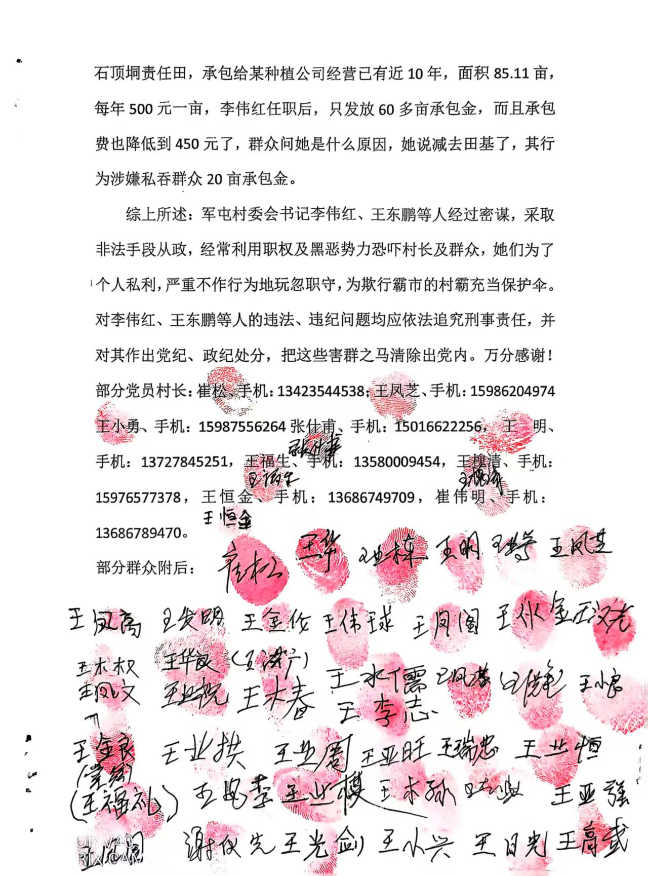 综上所述:军屯村委会书记李伟红、王东鹏等人经过密谋,采取非法手段从政,经常利用职权及黑恶势力恐吓村长及群众,她们为了个人私利,严重不作行为地玩忽职守,为欺行霸市的村霸充当保护伞。对李伟红、王东鹏等人的违法、违纪问题均应依法追究刑事责任,并对其作出党纪、政纪处分,把这些害群之马清除出党内。万分感谢!