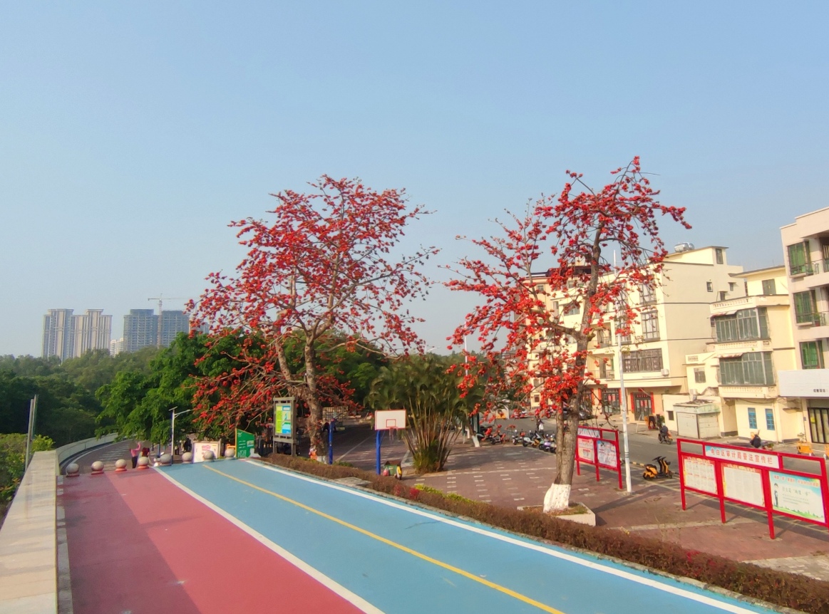 虽然或许只有两棵木棉古树,不过花开时节远处近近的视觉感观还是勉强勉为可以,还伴有鸟语声车来车往等等各种声音~,还有另外好些地方也有零零星星的木棉花开,