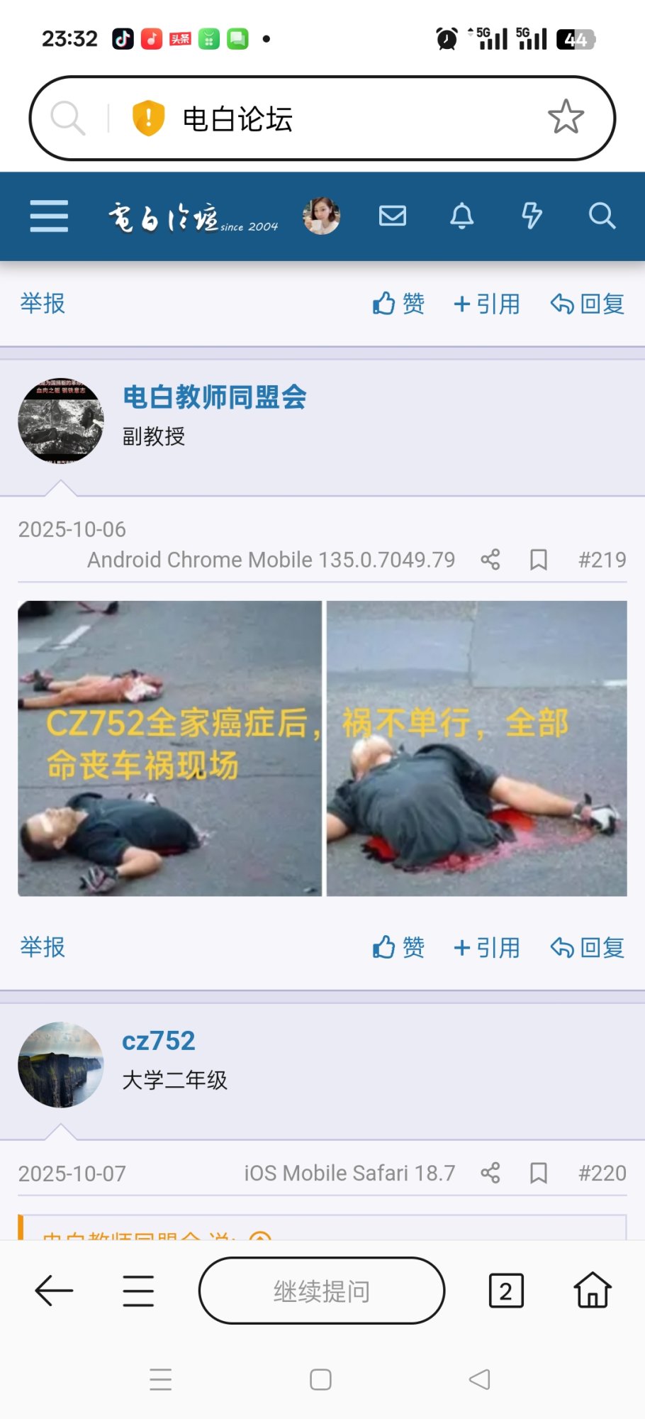 cz752 大学三年级 注册 2019-12-20 消息 802 反馈评分 94 点数 11 2025-10-16 iOS Mobile Safari 18.7 #22 小石龟 说: 那你当面骂一次试试,又不是不给机会你 点击展开... 你家里是不是日日死人?日日发那些幼稚可笑的垃圾帖子上来,是不是要有人八你老母支坑才会消停?
