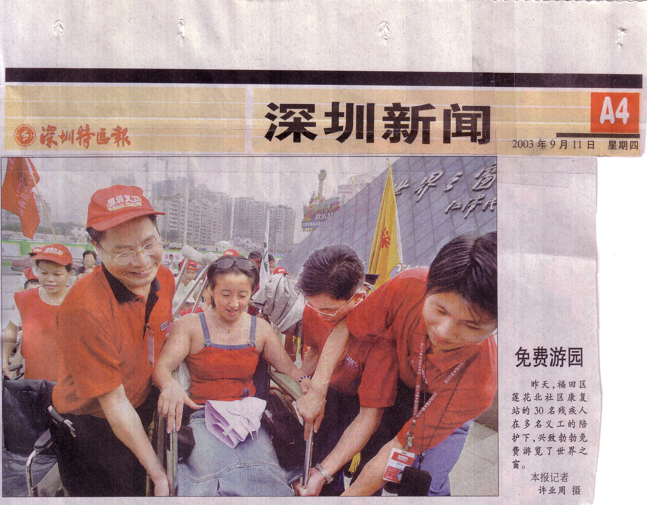 四中乐叔 版主 版主 注册 2006-05-06 消息 6,725 反馈评分 3 点数 61 2006-06-10 #59 四中乐叔 说: 四中乐叔 说: [snapback]1291071[/snapback] 点击展开... 2003年9月10日,深圳世界之窗助残活动。 点击展开... 附件 2003-9-10报道山姆、莲花北康复站世界之窗照片.jpg 1.7 MB · 查看: 271