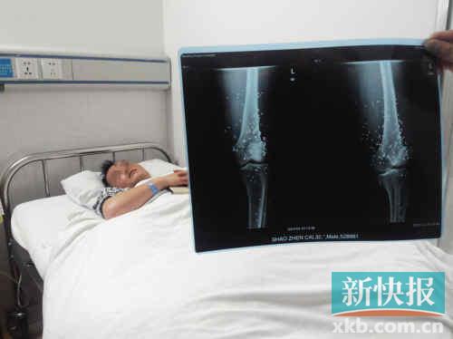 昨日上午,南方日报记者在茂名市人民医院见到了邵振才,他的双膝都被厚厚的纱布包裹着,无法动弹,从X光片看到,双腿膝盖位置遍布密密麻麻的霰弹,粗略统计每个膝盖都有近两百粒霰弹,令人不寒而栗。而他的哥哥邵振锋伤势更加严重,左手肌腱几乎完全被砍断,右脚膝盖骨错位骨折,由于失血过多,送到医院后经过两个多小时的抢救才苏醒过来。