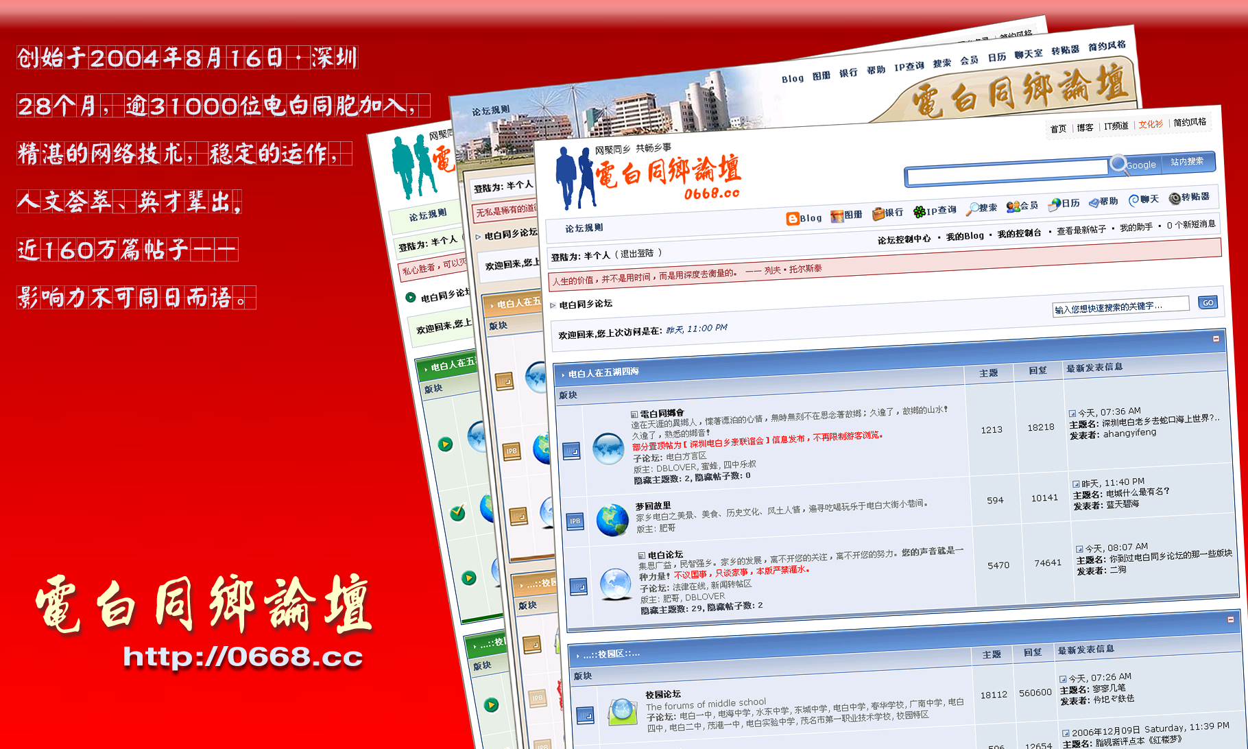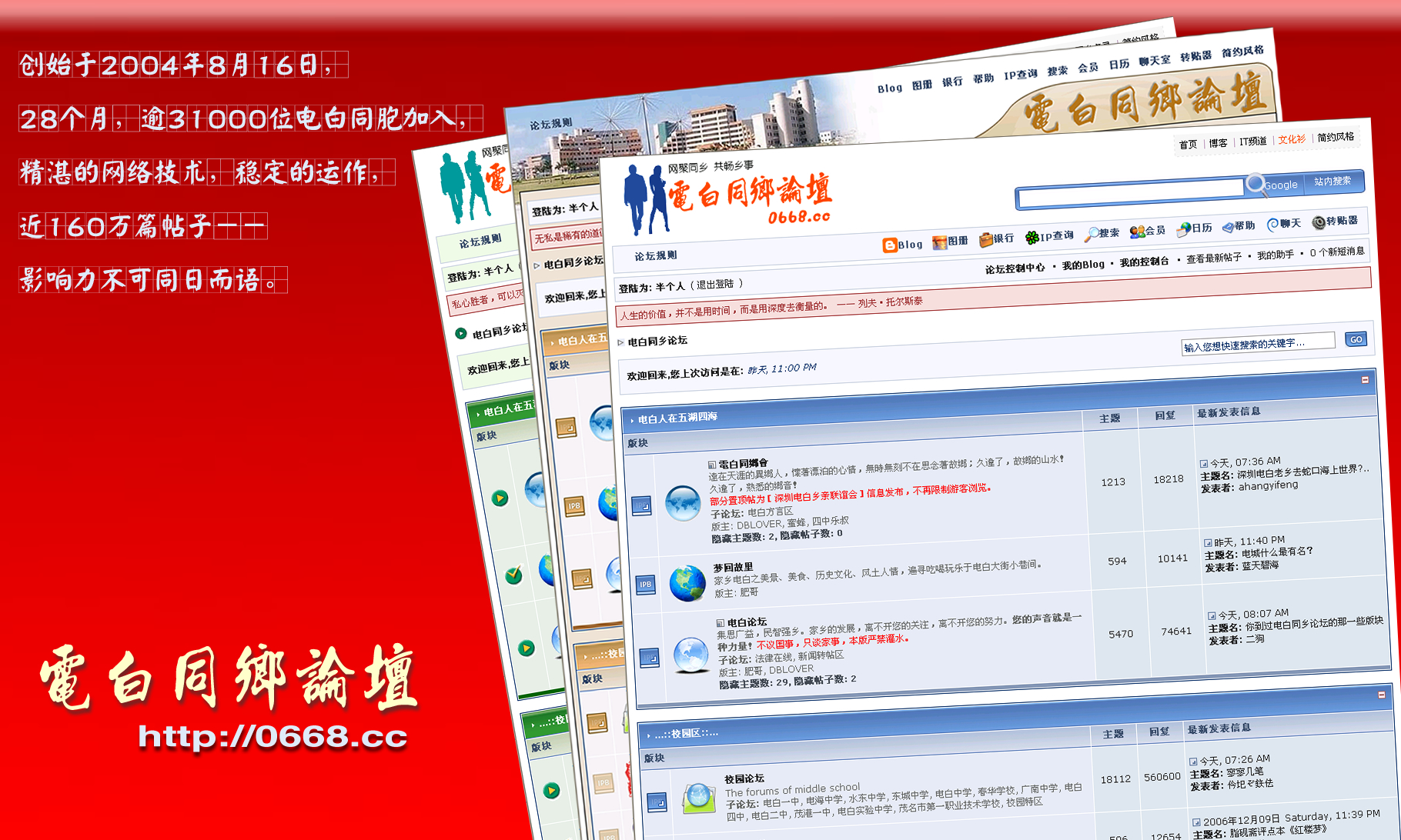 感觉很单调。没什么视觉冲击力。建议加些比较有影响的帖子的标题或图片在。如率先报道水事件。 但如果这样又有问题,有影响的帖子通常都敏感。 唉 不如把创建于什么时候,有多少会员的宣传语换成论坛精神,风格的语言。如敢言敢为等。