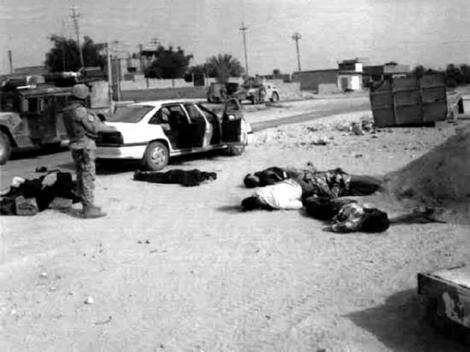 有照片显示了路边炸弹袭击造成的弹坑以及美军被炸毁的军车。在路边炸弹袭击中,一名美海军陆战队下士身亡,这也导致了哈迪塞惨案的发生。一张照片显示,一名伊拉克小男孩身着睡衣仰面朝天躺在地上,脸和头部满是血污,美军的一架直升机停在小男孩尸体的旁边。还有一张照片,一位年轻的母亲躺在床上,双手伸开,三个子女的尸体蜷缩在这位母亲身体的右侧。