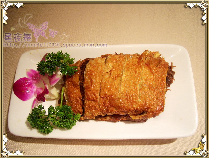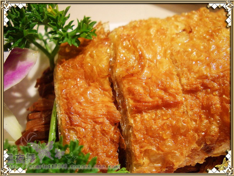 金黄酥脆的豆腐皮 明明是软和的材料 偏生炸得带些脆 色泽比之真鸭皮可要灿烂得多