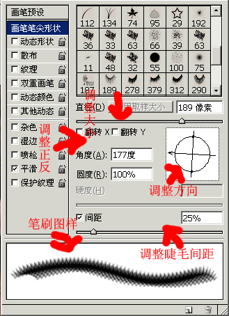 点击画笔浮动面板的“画笔笔尖形状”处,再根据你的需要,调整睫毛的大小,间距,方向即可。